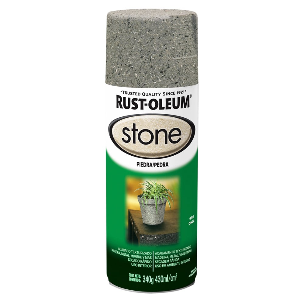 Pintura en aerosol que deja un acabado decorativo texturado símil piedra y transforma objetos comunes en proyectos únicos que imitan el look y la textura de la piedra.