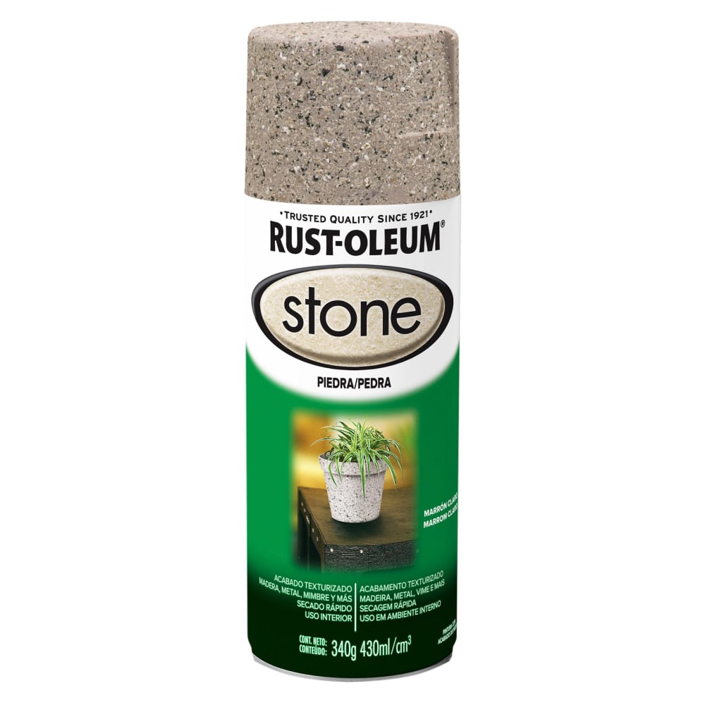 Pintura en aerosol que deja un acabado decorativo texturado símil piedra y transforma objetos comunes en proyectos únicos que imitan el look y la textura de la piedra.