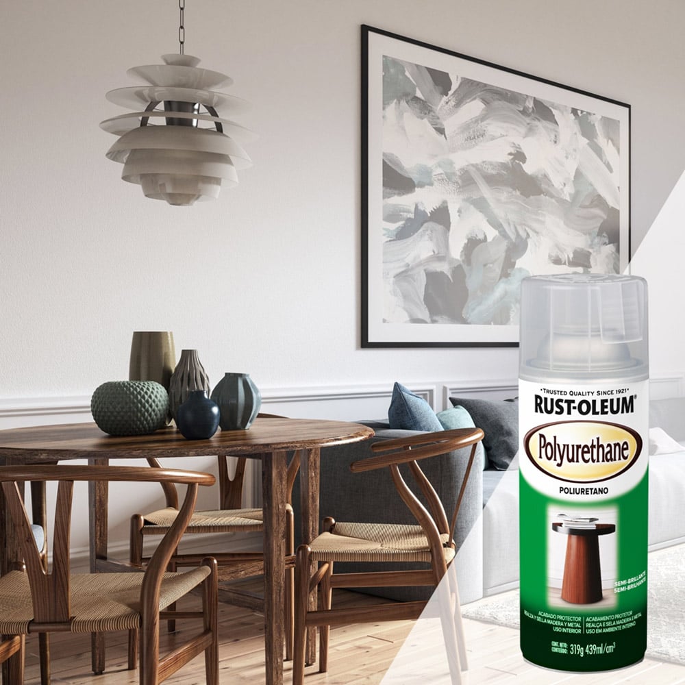 Aerosol que proporciona un acabado protector transparente que permite ver la veta de la madera, resaltando su belleza.