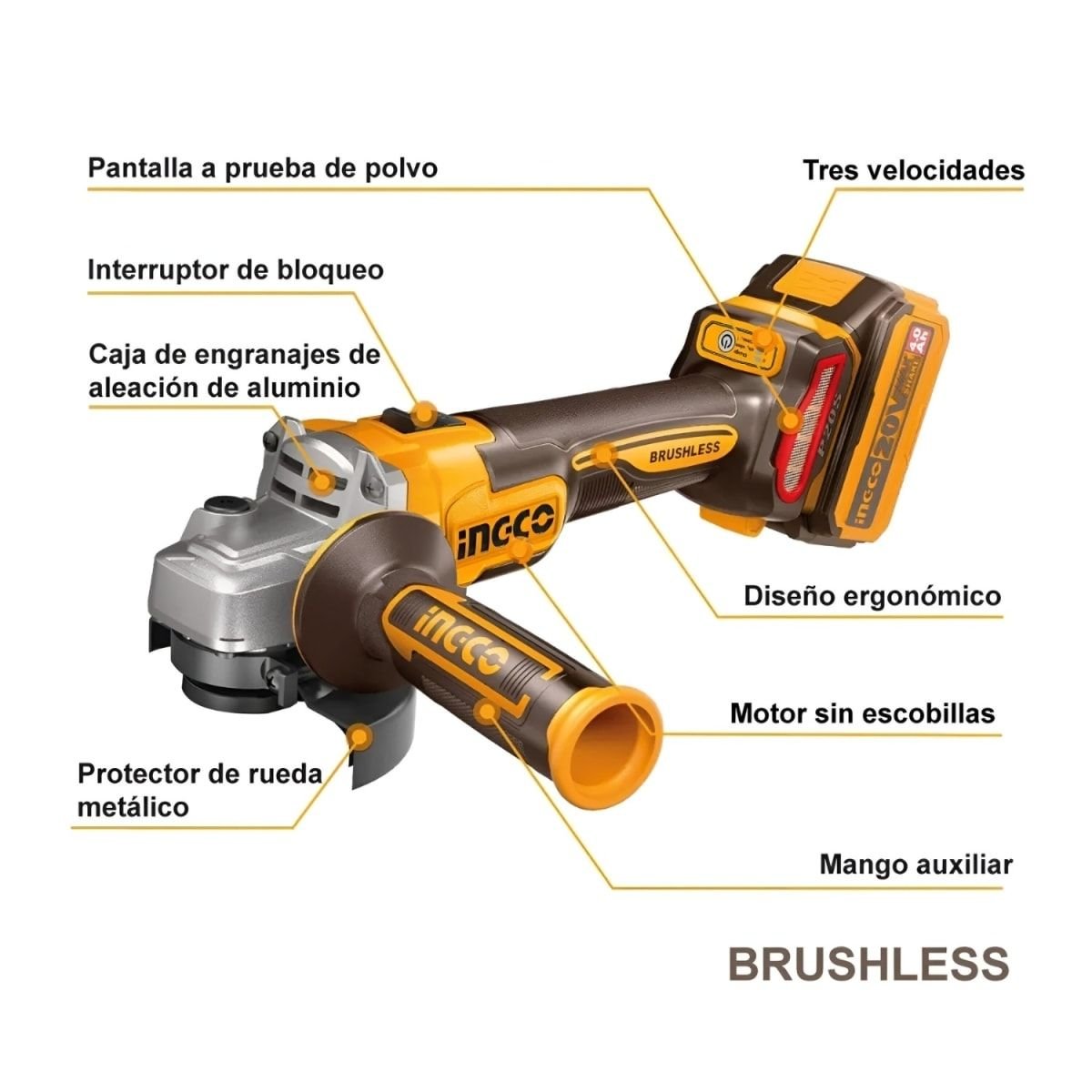 Amoladora Angular INGCO 4 1/2″ 20V 900W BL + Bat CAGLI261521