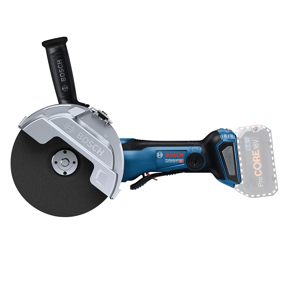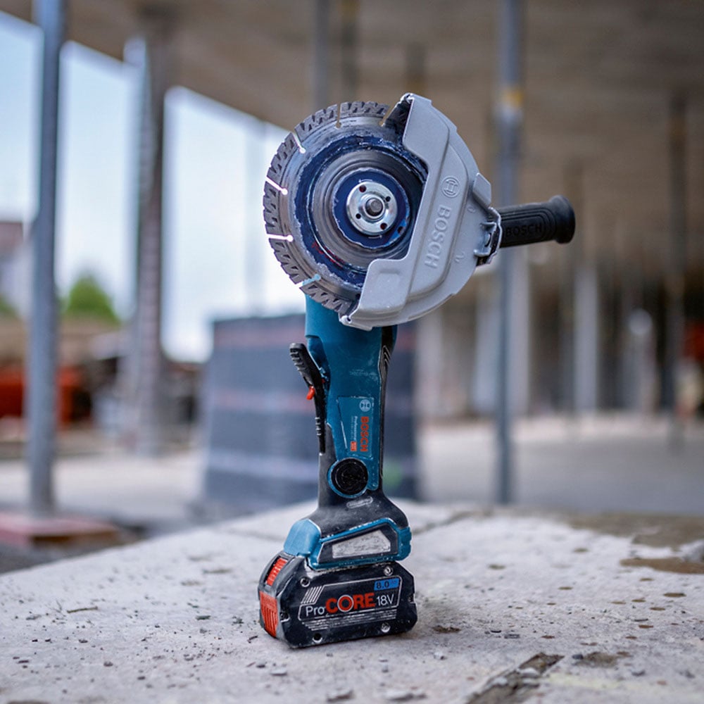 La amoladora angular es compatible con todas las baterías y cargadores Bosch Professional de 18 V (Professional 18V System); para obtener la máxima potencia, utilice ProCORE18V ≥ 5,5 Ah.