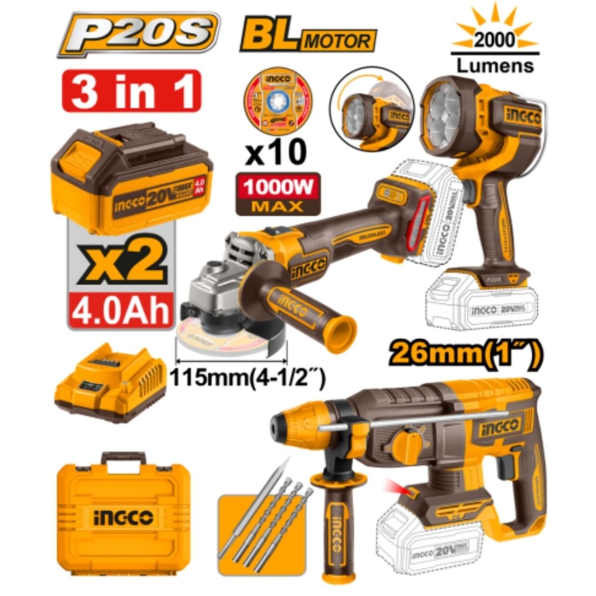 AMOLADORA + ROTOMARTILLO + LAMPARA + 2 BAT COSLI250183 INGCO