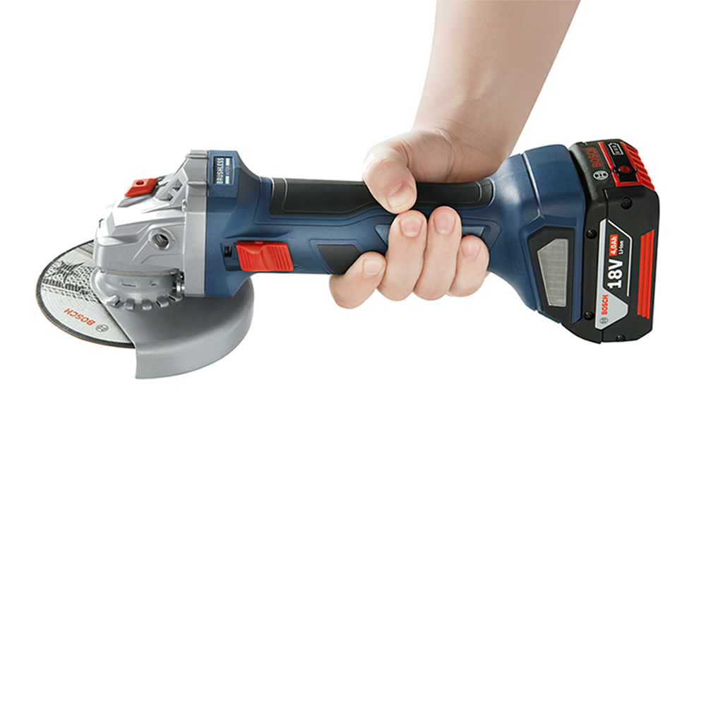 La Amoladora Angular a Batería de 5″» Bosch GWS 180-LI, 18V, con motor sin escobillas de carbón, posee potencia equivalente a una herramienta con cable de 700W.