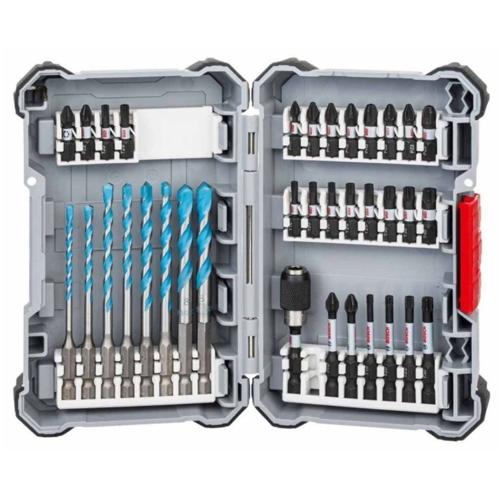 El Kit forma parte del sistema Bosch Pick and Clic que cuenta con cajas de almacenamiento modulares y permite la personalización. Los compartimentos incorporados aseguran los Juegos de puntas y brocas con un solo clic, lo que permite al usuario realizar un montaje rápido del kit según su necesidad y también sustituirlo por nuevos Juegos adquiridos con el mismo sistema. Todas las puntas y Brocas tienen encastre hexagonal de 1/4″ y son adecuadas para su uso en llaves de impacto, taladros y destornilladores.