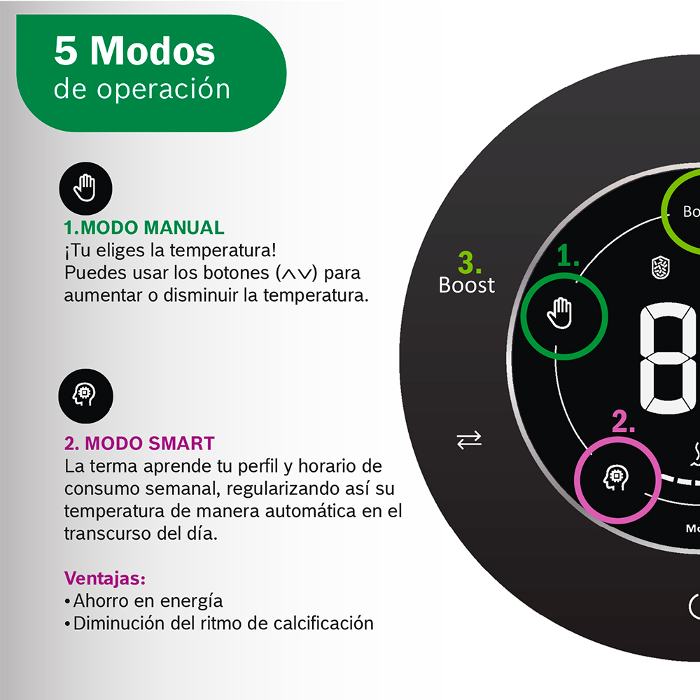 Único en el mercado con 5 modos de operación, ideal para todas las familias peruanas: Modo Smart, Turbo, Manual, Eco y de Programación