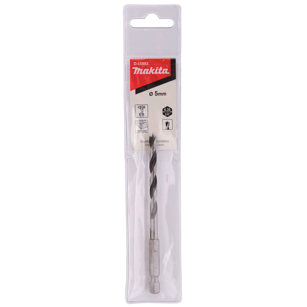 La Makita D-15883 es una broca para madera con vástago hexagonal de 1/4″, diseñada para taladrar agujeros limpios y precisos en madera maciza, tableros, MDF, contrachapado y otros materiales similares.