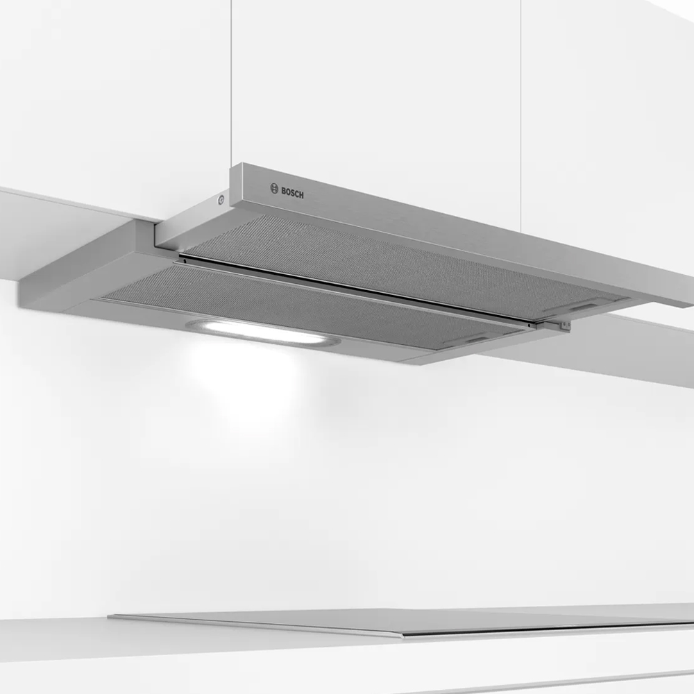 Es una campana extractora telescópica (o de tipo “flat” bajo mueble) de 90 cm de ancho, perteneciente a la Serie 4 de Bosch, con acabado en plata/metal (silver). Fue diseñada para integrarse bajo un módulo alto de cocina con un frente discreto que se extrae cuando se cocina, permitiendo una estética limpia mientras no se usa. Cuenta con extracción de aire potente (hasta ~ 368 m³/h) para eliminar humos, olores y vapor de cocción, filtros de grasa lavables, iluminación LED, y la capacidad de funcionar tanto en modo extracción al exterior como en recirculación (dependiendo de la configuración). Es una buena opción para cocinas más amplias que necesitan cobertura de 90 cm, manteniendo un diseño embutido y elegante.