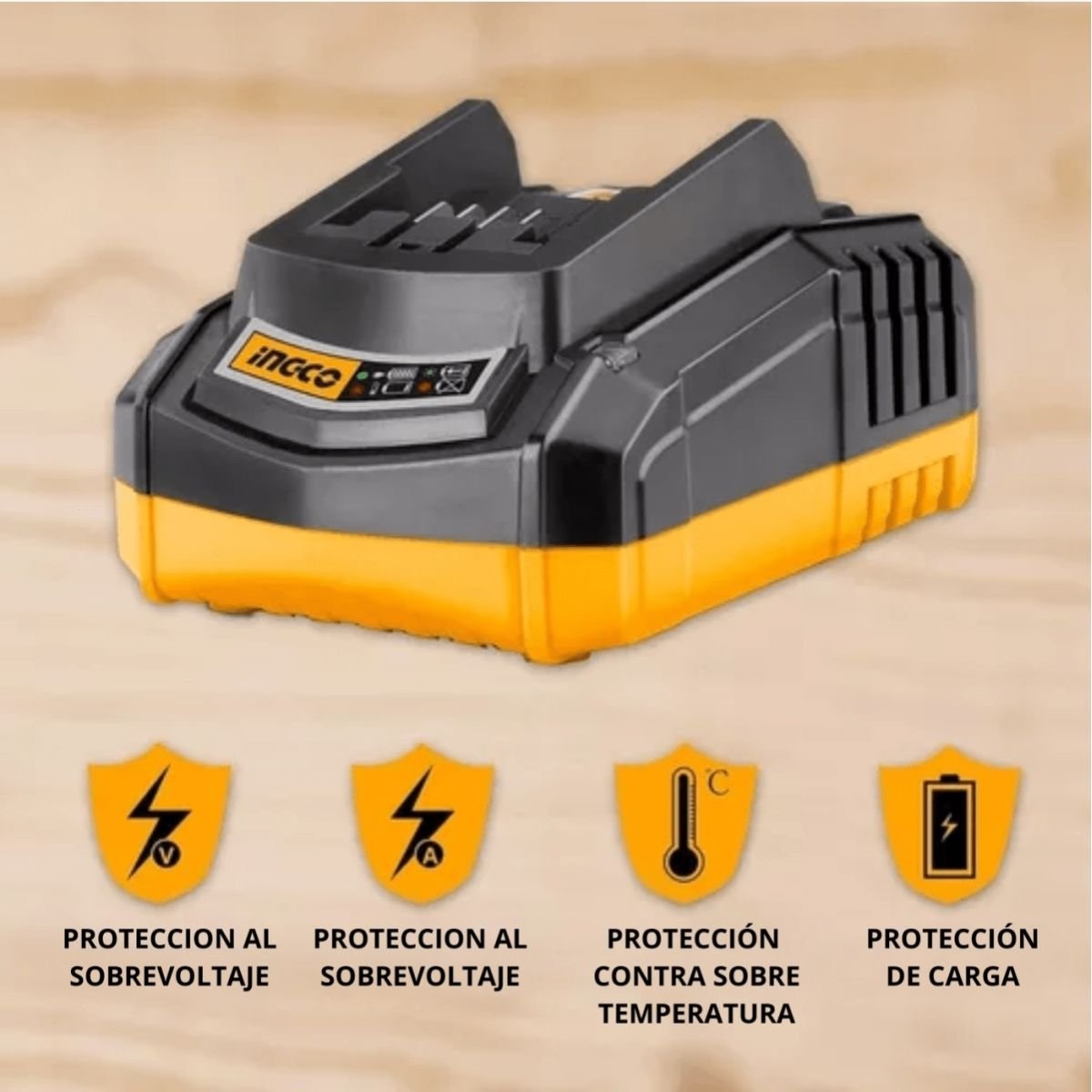 Cargador rápido de iones de litio diseñado para recargar baterías INGCO de 20V con seguridad y eficiencia. Proporciona el voltaje y la corriente adecuados para evitar sobrecargas, controlando temperatura, voltaje y flujo de energía durante todo el proceso de carga. Ideal para talleres, trabajos profesionales y uso doméstico que requiere un rendimiento confiable y rápido.