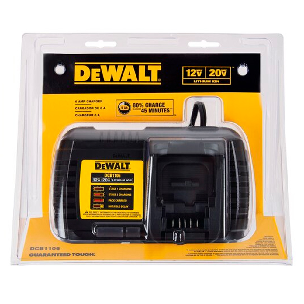 Este cargador de 6 amperios ofrece la mayor versatilidad para todas tus necesidades de carga. Todas las baterías de iones de litio dentro de nuestra gama compacta de 12 V, 20 V MAX*, y la gama de baterías DEWALT FLEXVOLT son compatibles con este cargador. Los nuevos indicadores LED de etapa 1 y etapa 2 comunican más sobre el estado de carga de la batería que los que no tienen. El LED de etapa 1 parpadea hasta que la batería esté aproximadamente cargada del 80%. Luego se mantiene sólido y el LED de etapa 2 parpadea hasta que la batería esté completamente cargada. El cargador de 6 amperios también cuenta con soportes de agujero pasante, cierre seguro y doble aislamiento.