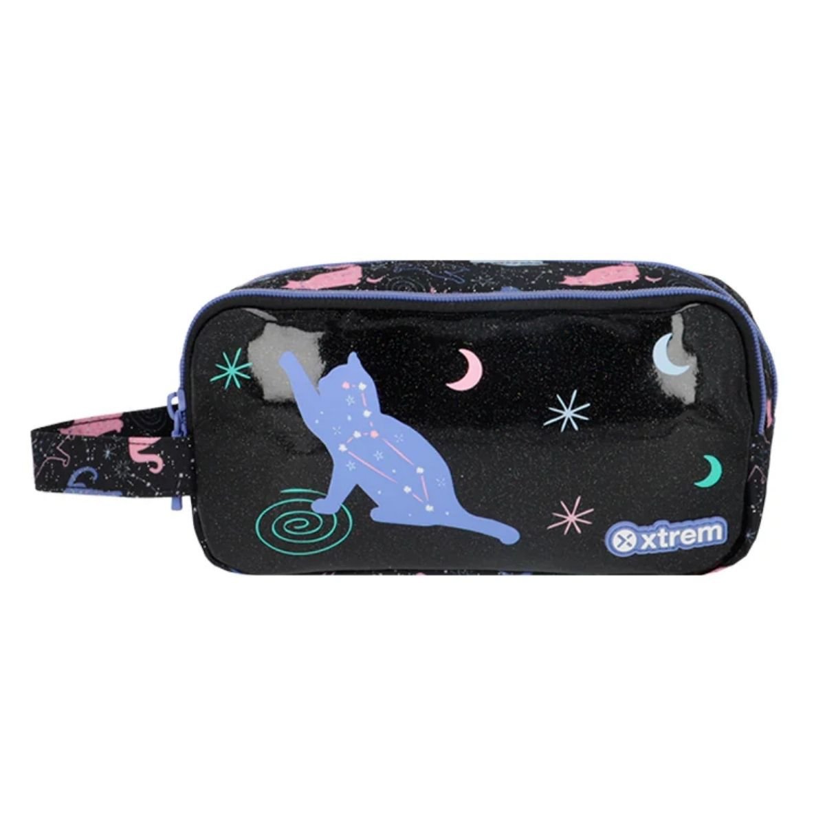 La cartuchera Xtrem University Black Purple Cat destaca por su diseño original con estampado de gato en tonos morados, celestes y rosados con detalles de constelaciones. Ofrece gran capacidad y organización gracias a sus tres compartimentos independientes, permitiendo mantener todos los útiles ordenados. Fabricada con materiales resistentes y forro interior reciclado, es ideal para el uso diario en escuela, universidad u oficina.