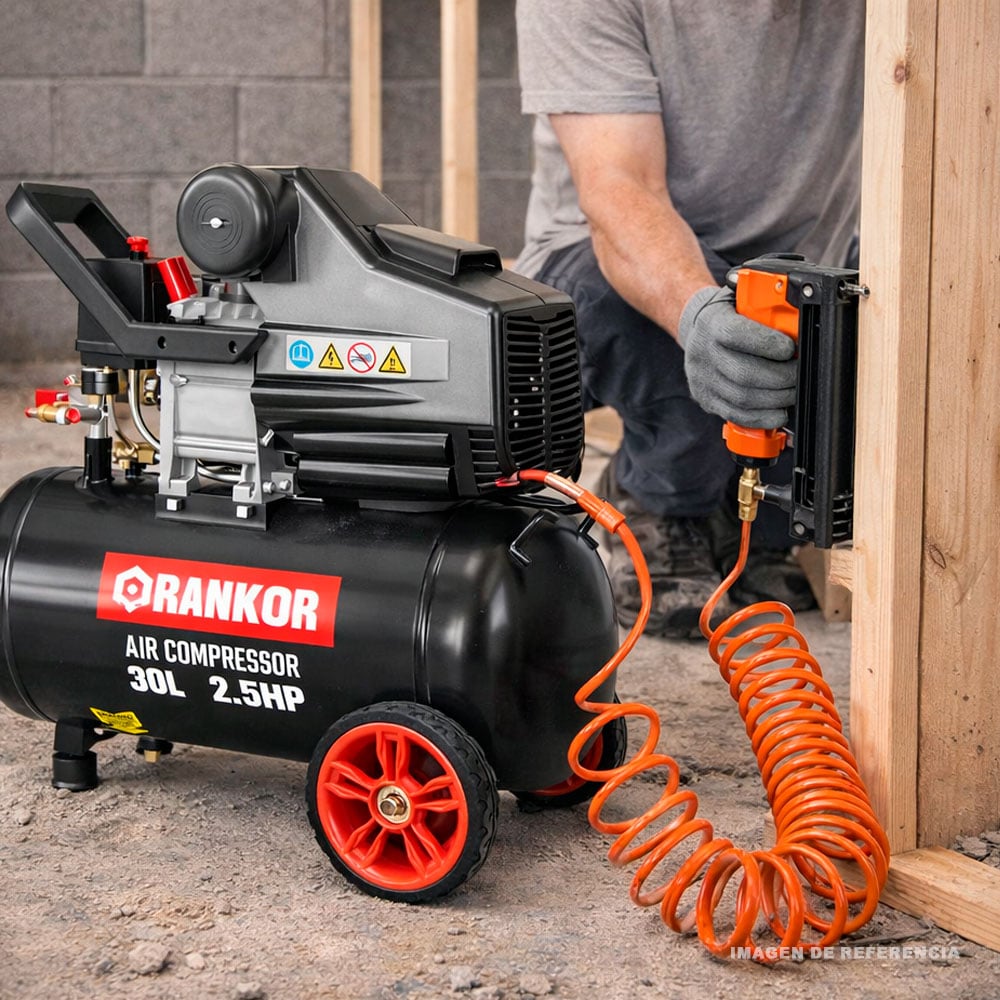La compresora de aire Rankor 2.5 HP 30 litros Tipo F está diseñada para trabajos semiprofesionales y de taller que requieren un suministro constante de aire comprimido.