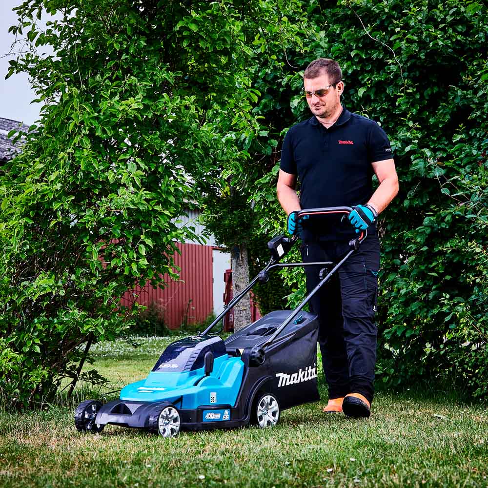 Plegable para un fácil almacenamiento cuando no está en uso, asidero cómodo y suave gracias a su recubrimiento de goma, dos baterías de litio de 18V LXT 6.0 Ah que proporcionan la potencia y el tiempo de funcionamiento necesario para alcanzar los 35 minutos de uso. Ajuste de altura de corte con una palanca que consta de 13 posiciones (20 – 75 mm).