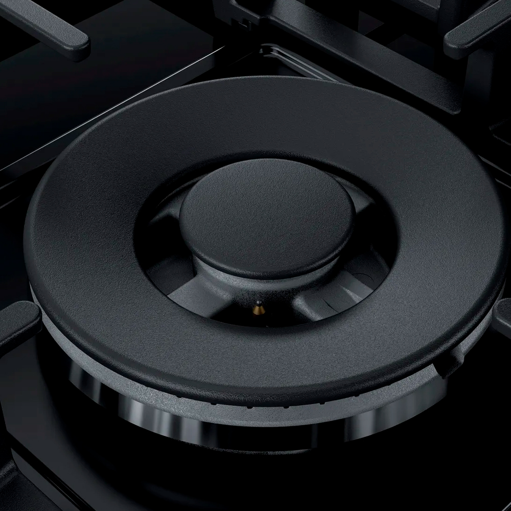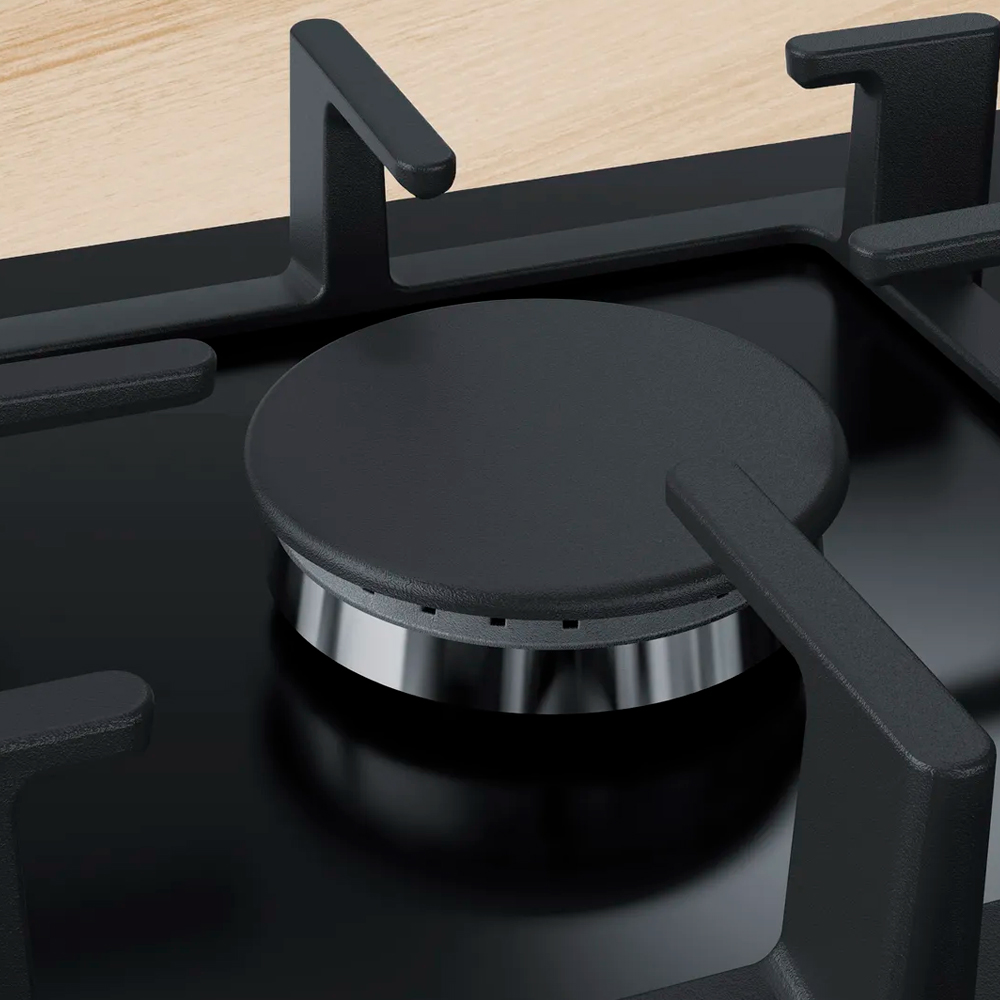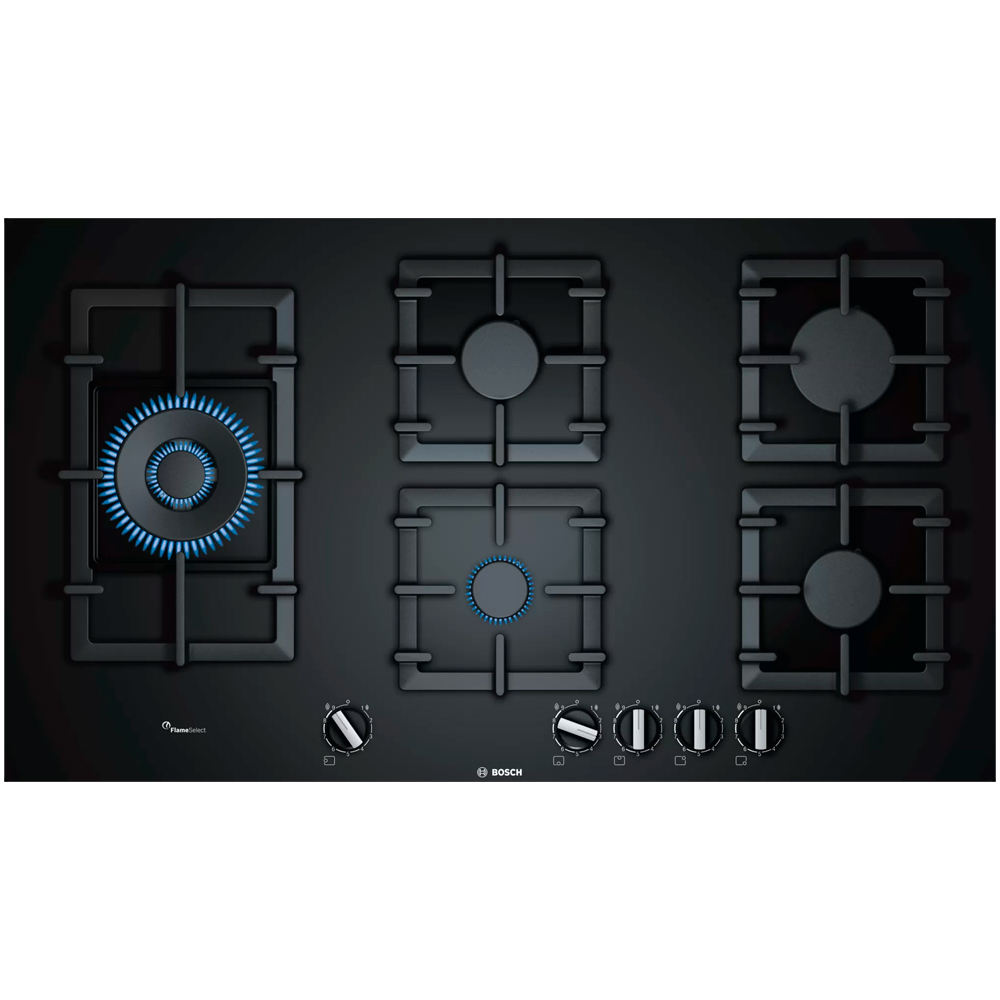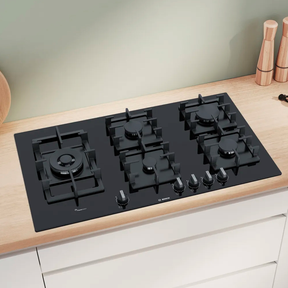 Pertenece a la línea Serie 6 de Bosch y ofrece superficie de vidrio templado negro de 90 cm de ancho con 5 quemadores de gas. Incorpora la tecnología FlameSelect que permite regular la llama en 9 niveles predefinidos, lo que brinda un control preciso de la cocción. Tiene un quemador tipo Wok de alta potencia (~4 kW) para preparaciones exigentes, parrillas de hierro fundido, diseño “frameless” (para instalación nivelada o ligeramente elevada) y dispositivo de seguridad por fallo de llama. Ideal para cocinas amplias donde se requieren múltiples zonas de cocción y acabado premium.