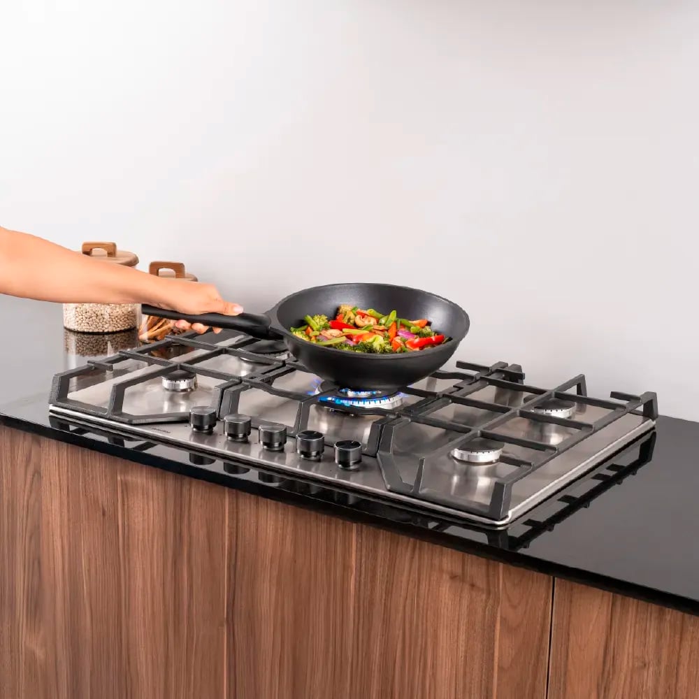 Encimera a gas diseñada para integrarse en muebles de cocina y optimizar el espacio.