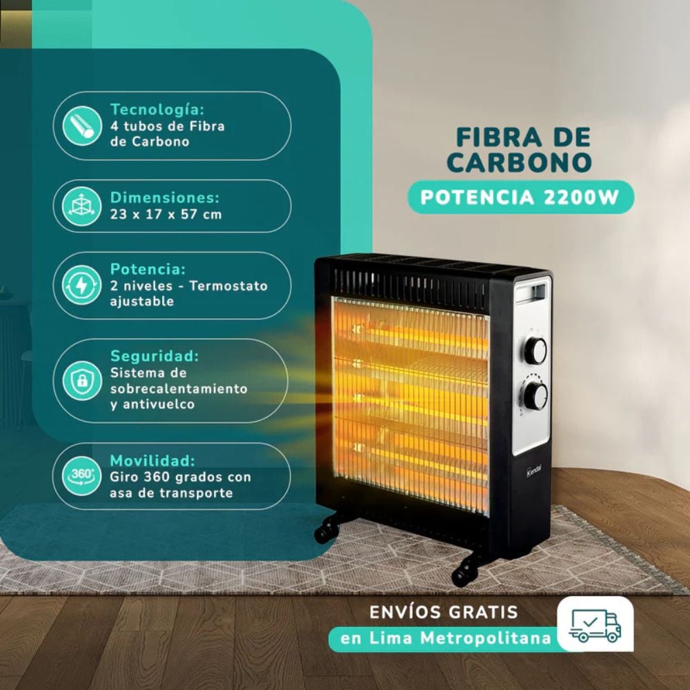 Vive el máximo confort con la Estufa Eléctrica KENDAL KNSB-220, equipada con 4 tubos de fibra de carbono que generan calor inmediato, eficiente y uniforme. Su potencia de 2200 W asegura una temperatura ideal en ambientes de hasta 20 m², mientras su diseño moderno combina elegancia y durabilidad. Perfecta para uso en hogares, oficinas o terrazas cerradas, ofrece bajo consumo energético, funcionamiento silencioso y seguridad térmica avanzada.