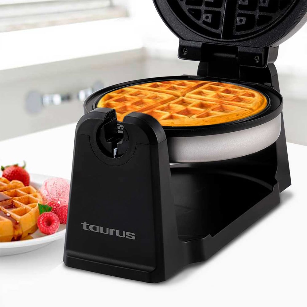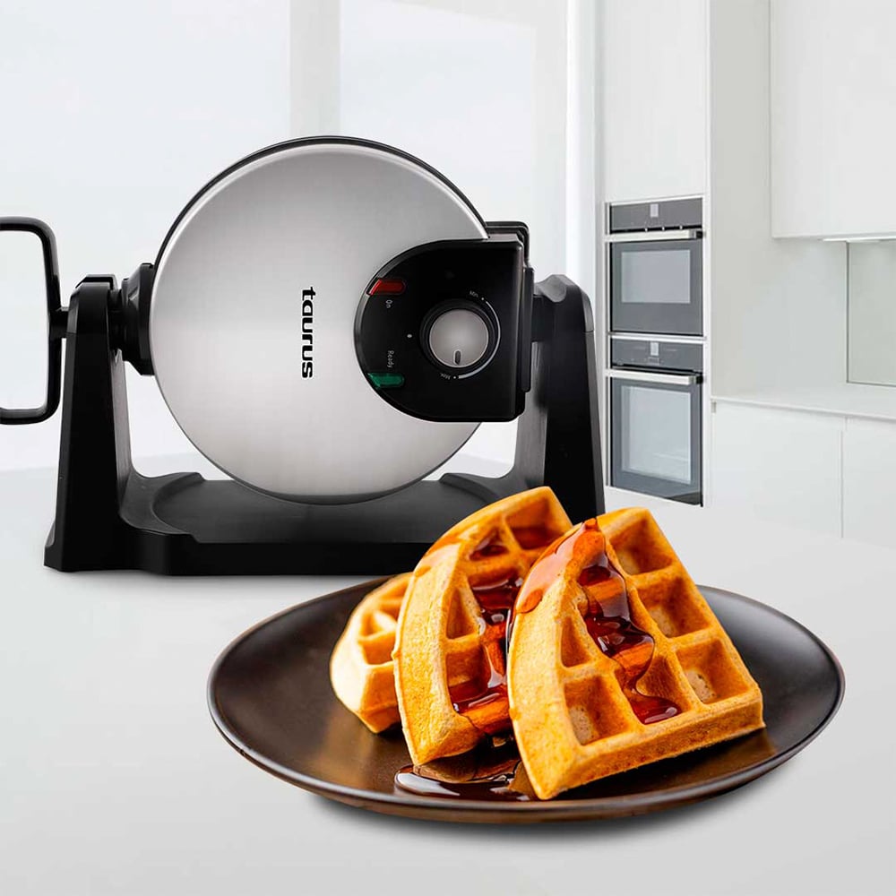 Gofrera con sistema giratorio para una óptima distribución de la masa: prepara 4 gofres a la vez de la forma más rápida y sencilla