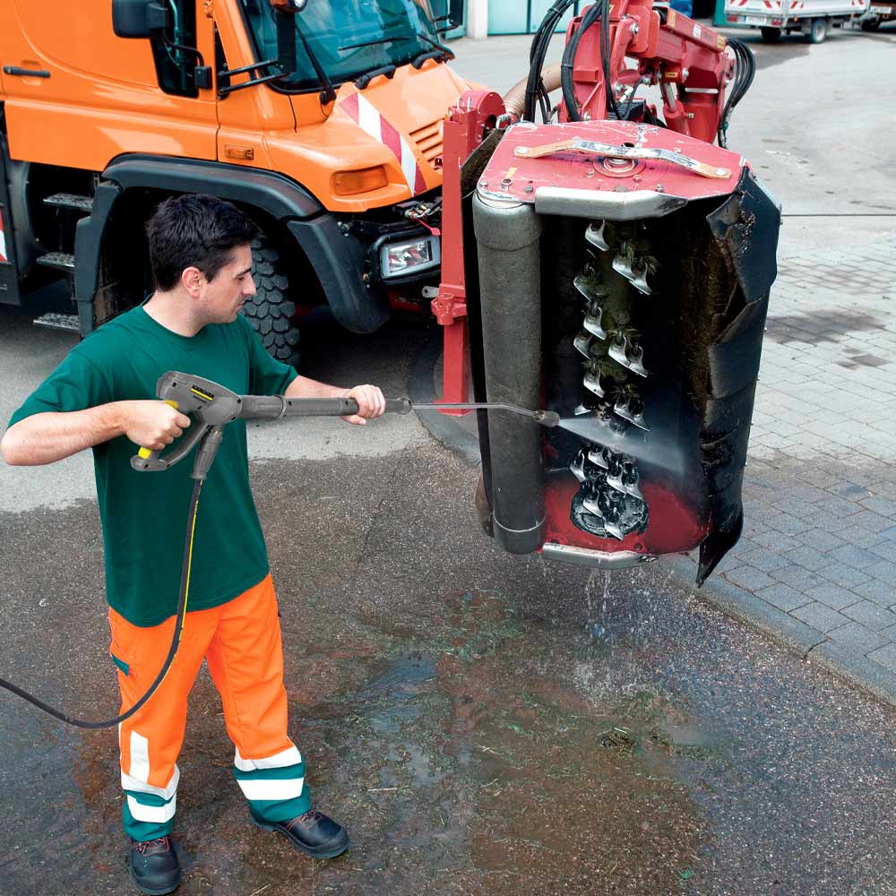 Mientras que la pistola de alta presión EASY!Force aprovecha la fuerza de retroceso del chorro de alta presión para reducir a cero la fuerza de retención, los cierres rápidos EASY!Lock permiten un manejo cinco veces más rápido que las conexiones por rosca convencionales sin repercutir negativamente en la robustez y la larga vida útil.