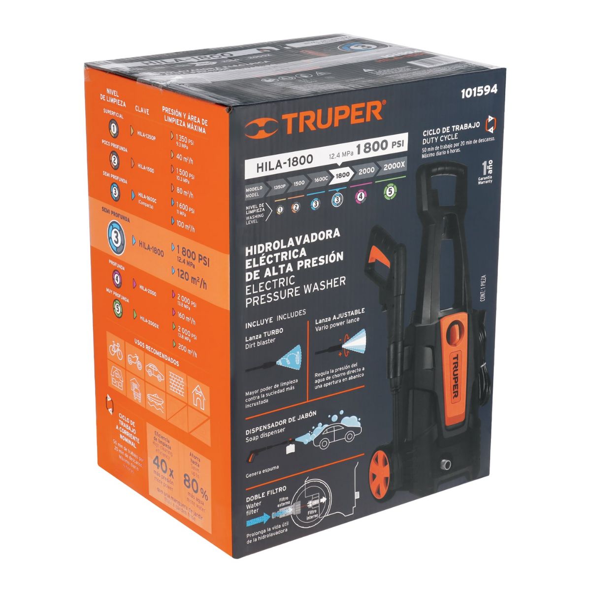 La hidrolavadora eléctrica Truper de 1800 PSI es ideal para trabajos domésticos de limpieza intensiva, gracias a su potente motor de 2 HP (1,500 W) y sistema de paro automático que mejora la seguridad y eficiencia energética.