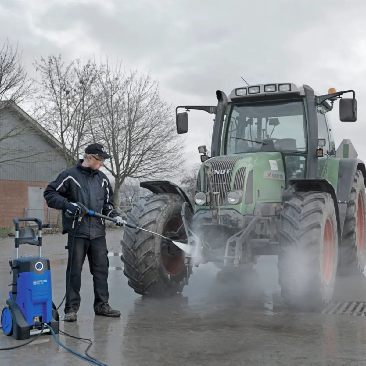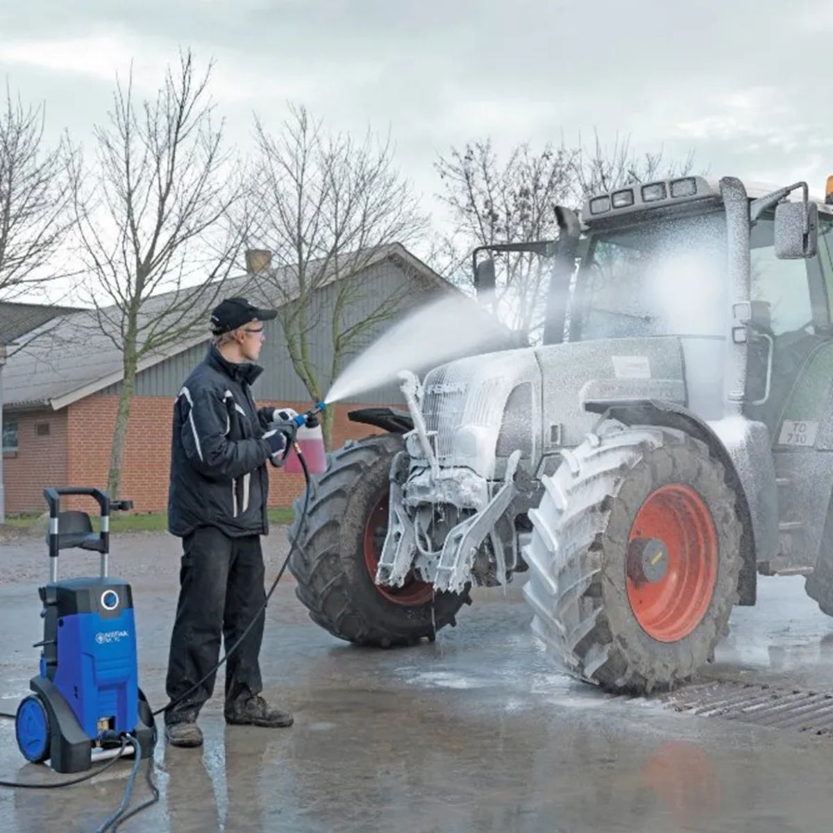 La hidrolavadora industrial Nilfisk MC 4M es una solución profesional de agua fría diseñada para tareas de limpieza generales de intensidad baja a media. Es ideal para comerciantes, pequeñas empresas de construcción, garajes y granjas. Incorpora un grupo motobomba profesional de 1750 rpm con pistones revestidos de cerámica y cabezal de latón, garantizando durabilidad, alto rendimiento y una larga vida útil. Su diseño robusto con ruedas grandes facilita el transporte en superficies irregulares, mientras que su sistema externo de detergente mejora la eficiencia de limpieza.
