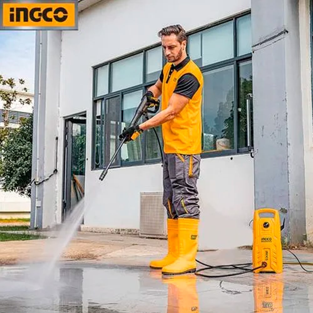 La hidrolavadora Ingco HPWR14008 es una limpiadora de alta presión con motor eléctrico de 1400 W ideal para lavar autos, patios, muros y superficies exteriores con mayor eficacia que una manguera convencional.