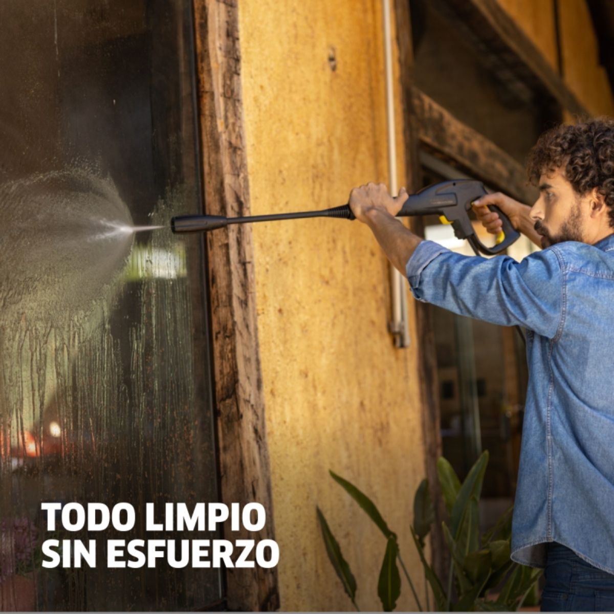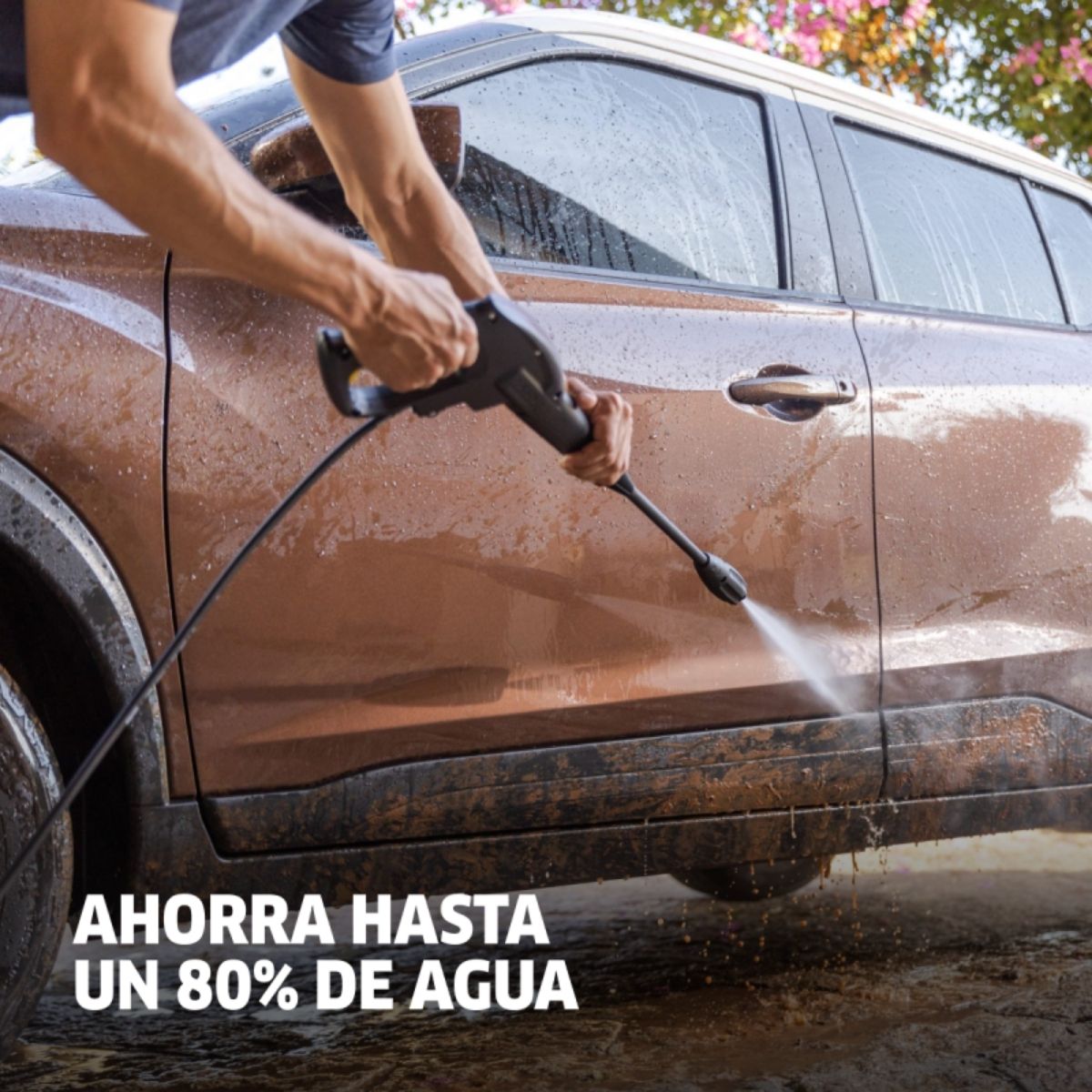 Equipada con bomba de aluminio, ofrece mayor durabilidad y resistencia. Además, permite ahorrar hasta un 80% de agua en comparación con métodos tradicionales. Incluye boquilla Vario Power para regular la presión según la superficie, así como lanza turbo para suciedad más difícil.
