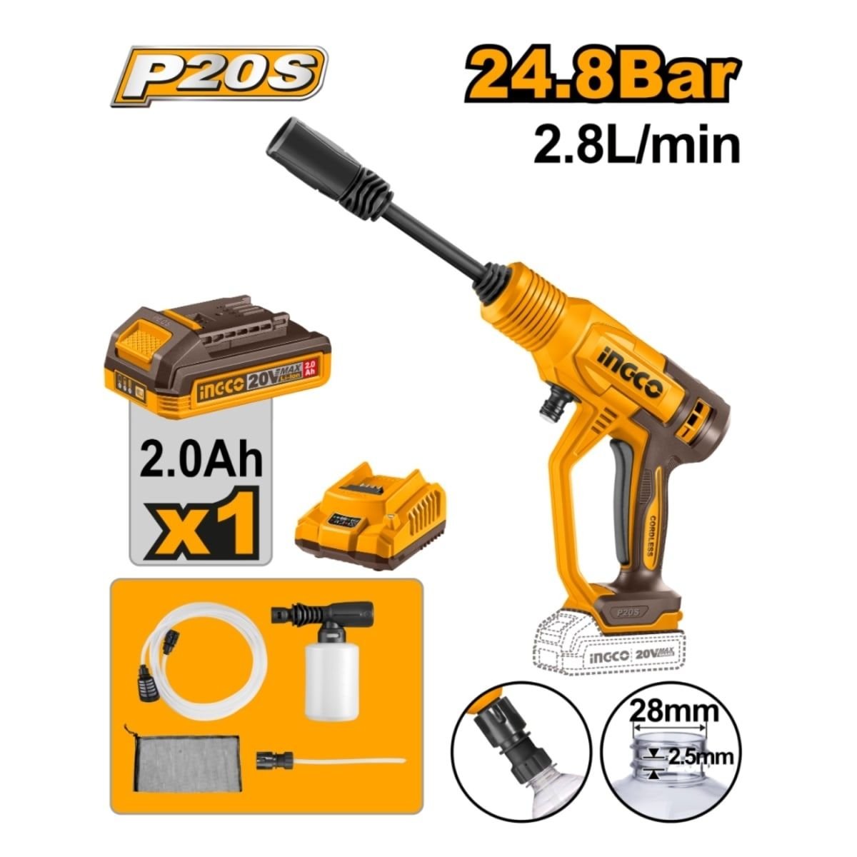 Hidrolavadora Portátil Ingco CPWLI20362 20V 24.8Bar + Batería y Accesorios