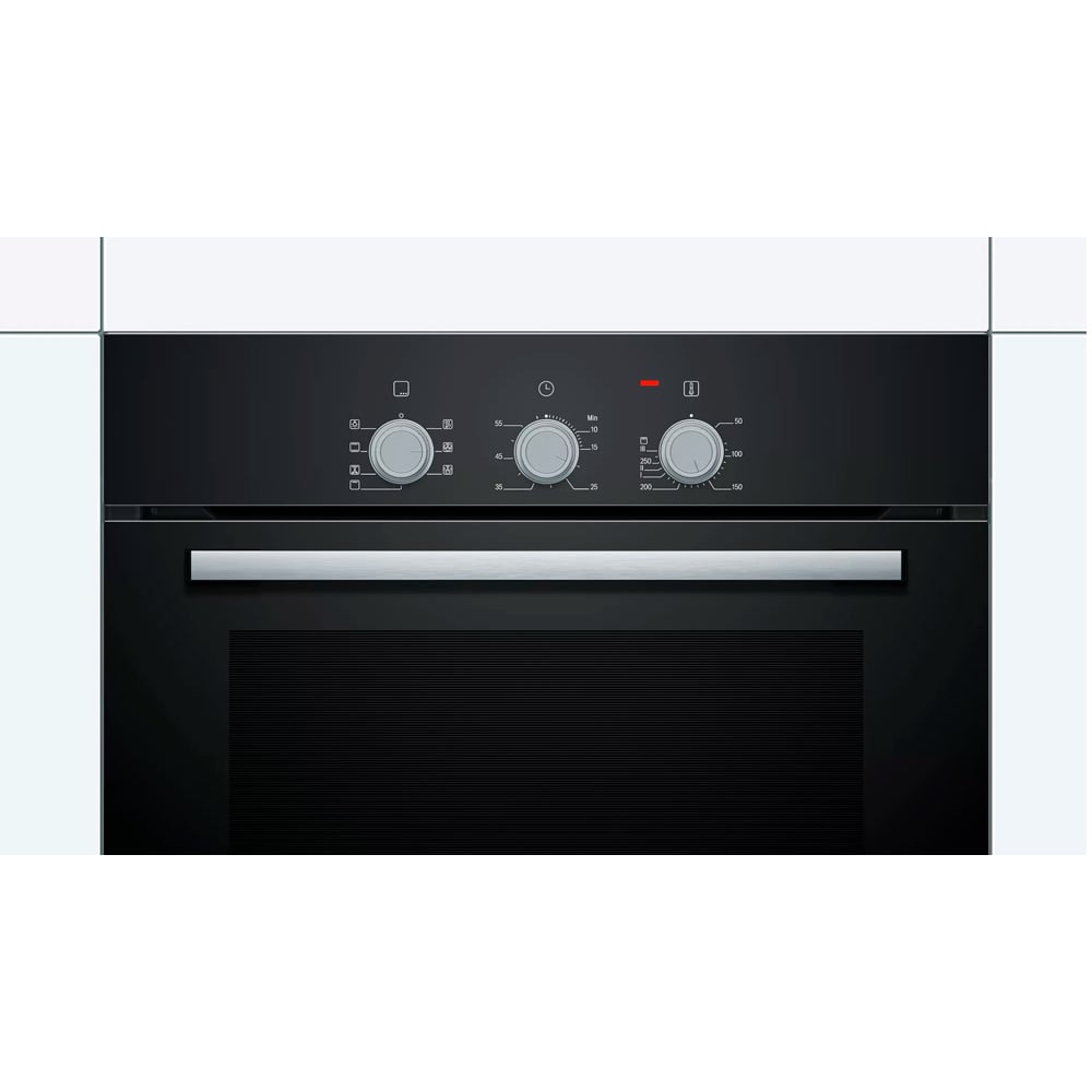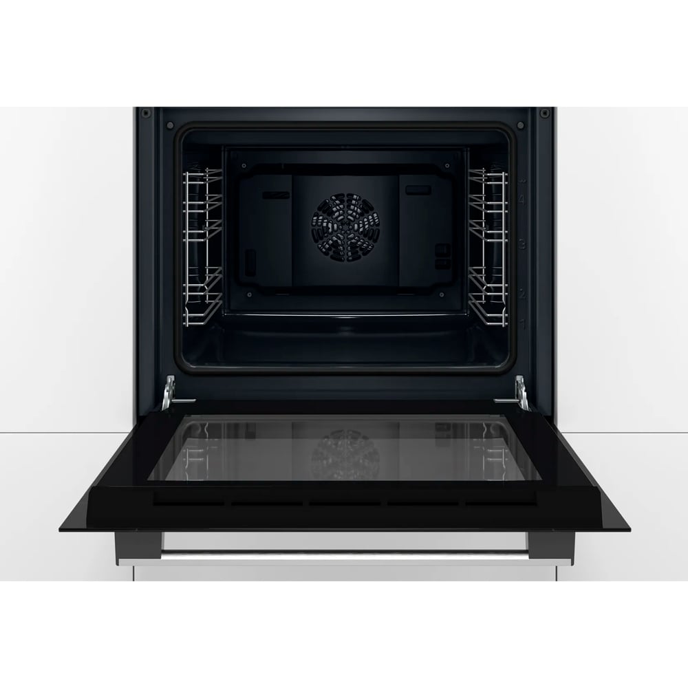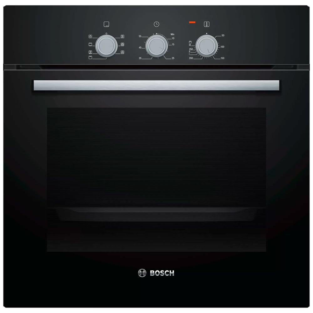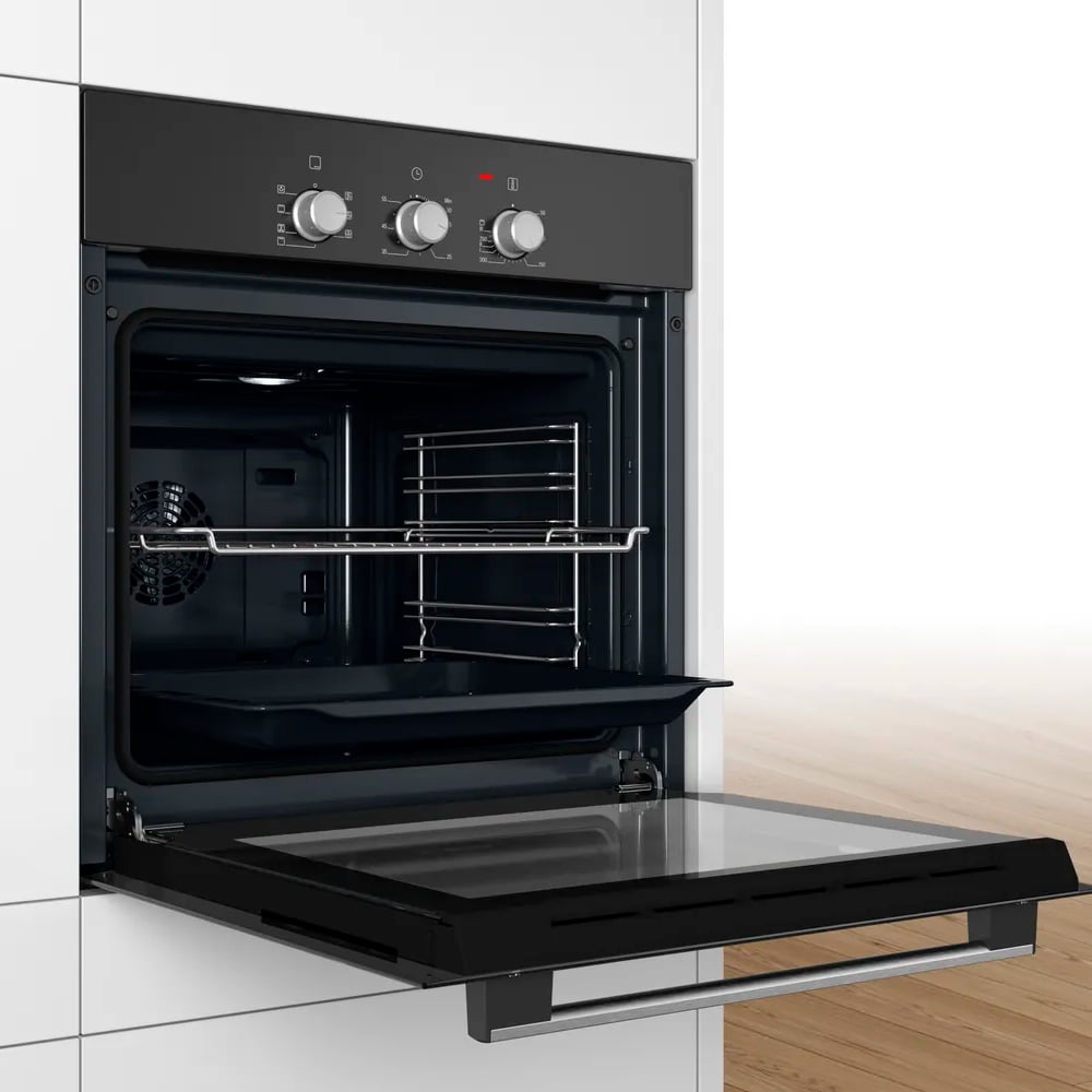 Es un horno empotrable de la serie 2 de Bosch, con dimensiones estándar de 60 × 60 cm, diseño integrado para muebles de cocina, volumen de cavidad de 66 litros, y acabado en color negro (y también versión acero inoxidable). Ofrece múltiples modos de cocción (incluyendo 3D HotAir, grill ventilado, calefacción superior/inferior), rango de temperatura hasta ~270-275 °C, y buen rendimiento energético (clase A). Ideal para cocinas domésticas que buscan un horno fiable, funcional, con buena capacidad, sin extras ultra-premium