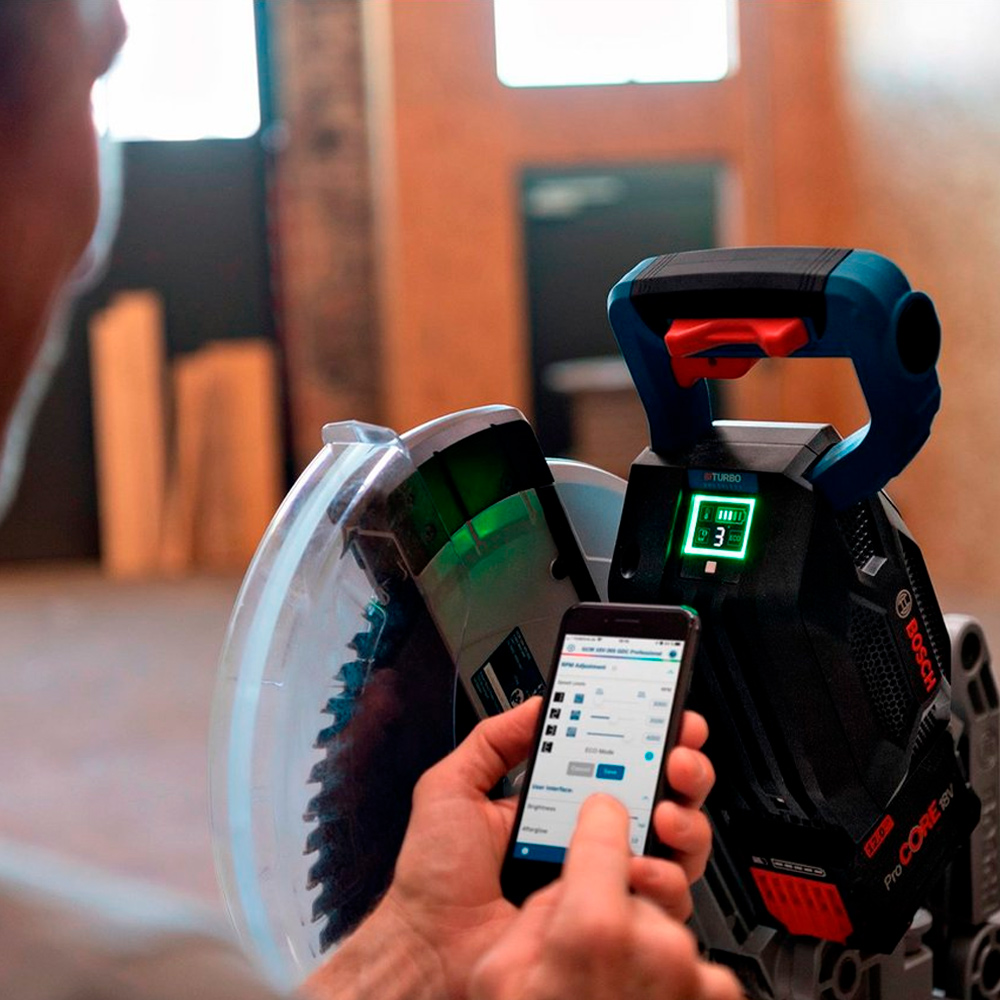 Esta sierra dispone de HMI y conectividad para una rápida comprobación del estado de la batería y selección del número de revoluciones, incluyendo el modo ECO.