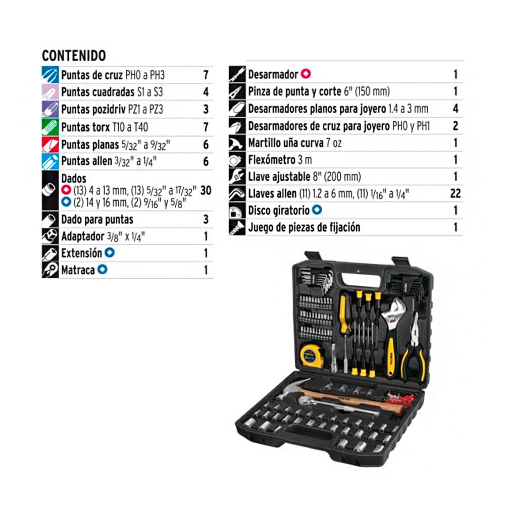 Incluye dados, puntas, llaves allen y herramientas manuales variadas