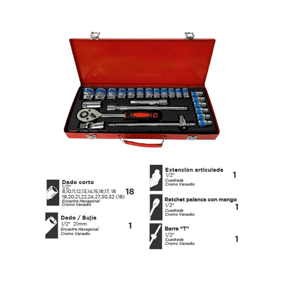 Juego de 24 piezas ideal para trabajos mecánicos y de mantenimiento general. Incluye una llave ratchet de 1/2″ y una variedad de dados y accesorios que permiten una gran versatilidad en tareas domésticas o profesionales.