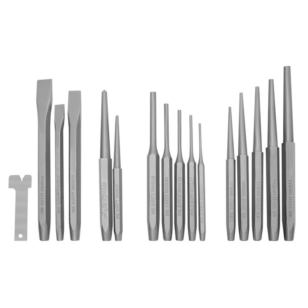 Juego de punzones y cinceles de 16 piezas, fabricados en acero cromo vanadio templado y endurecido para mayor resistencia.