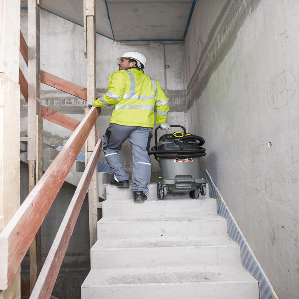 Junto con el contenedor grande y robusto de 50 litros con ruedas de metal y asa de empuje ajustable, el dispositivo no solo puede manejar cantidades muy grandes de polvos finos peligrosos en la clase de polvo M, sino también suciedad gruesa y líquidos.