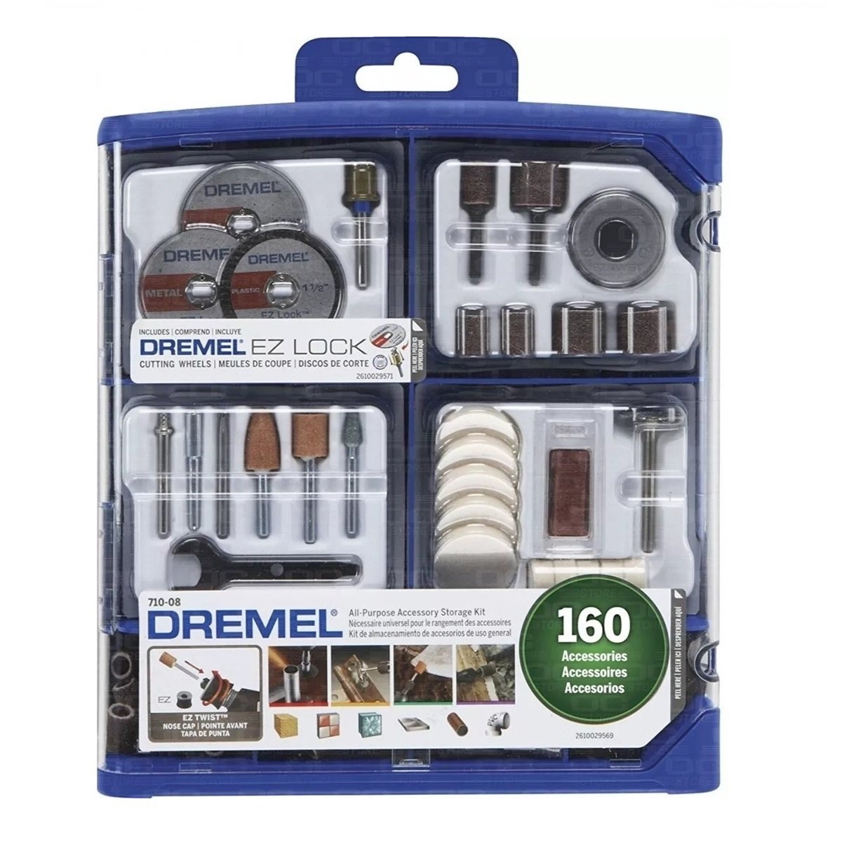 Una llave para tapa en la parte frontal EZ Twist, un adaptador con seguro EZ Lock y discos de corte EZ Lock forman parte de este kit de 160 piezas compuesto de accesorios Dremel originales.