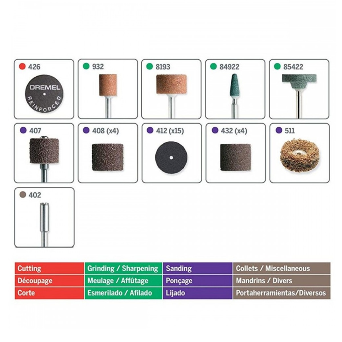 Afile herramientas de jardín, elimine el óxido, lije una puerta atascada, grabe en vidrio, ¡y más! Contiene 31 accesorios Dremel originales para satisfacer la mayoría de las necesidades lijado, alisado, perfilado o pulido.