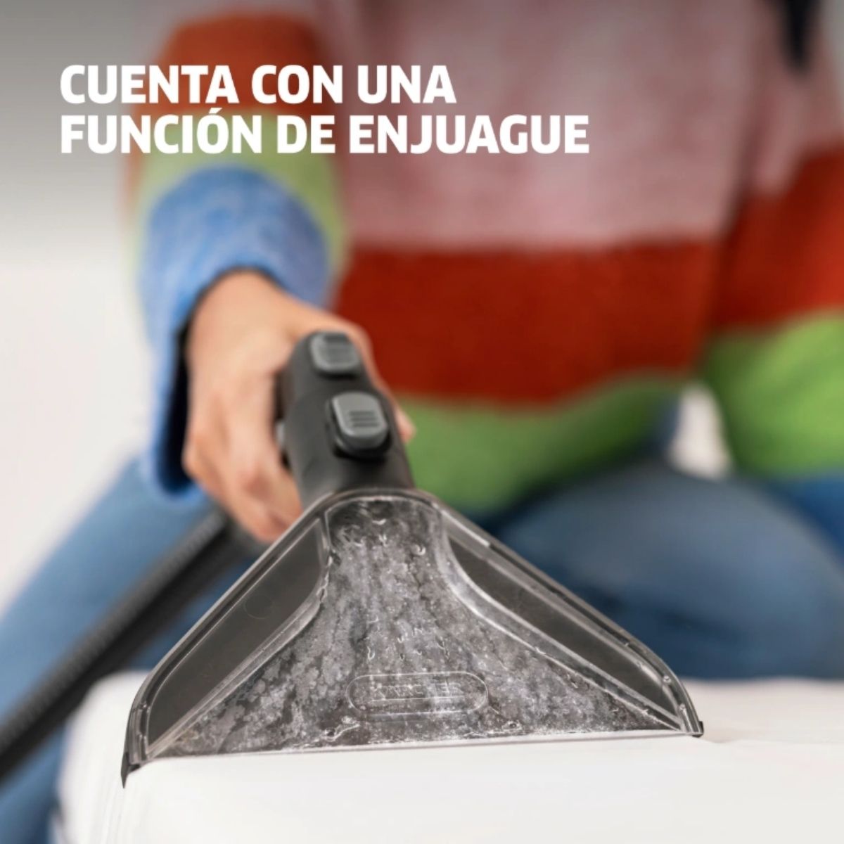 Utiliza el método de spray extracción que elimina la suciedad incrustada en las fibras, logrando resultados cercanos a limpieza profesional con baja humedad residual para un secado más rápido. Cuenta con depósitos separados de agua limpia (1.7 L) y agua sucia (2.9 L), facilitando el llenado y vaciado sin contacto con la suciedad.
