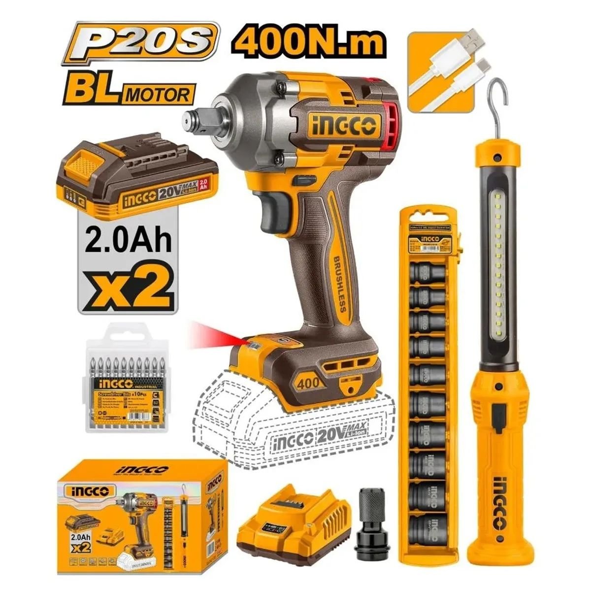 Llave de Impacto 1/2” Ingco COSLI23048 20V 400Nm Brushless + Linterna + Kit Accesorios