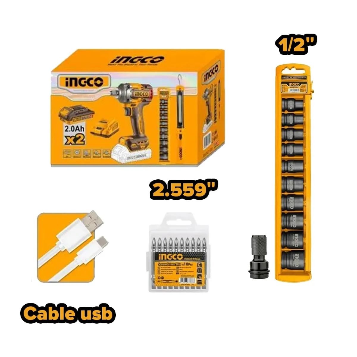 El kit Ingco COSLI23048 integra potencia, autonomía y versatilidad en una solución inalámbrica profesional. Incluye una llave de impacto 20V brushless con hasta 400 Nm de torque de apriete y 550 Nm de torque de afloje, ideal para desmontaje de ruedas, trabajos mecánicos, montaje estructural y mantenimiento industrial.