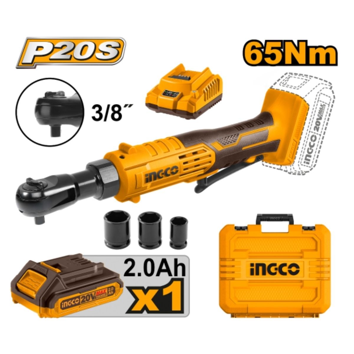 Llave Rachet 3/8″ 20V + Dados + Bat 2Ah CDRLI2060152 INGCO