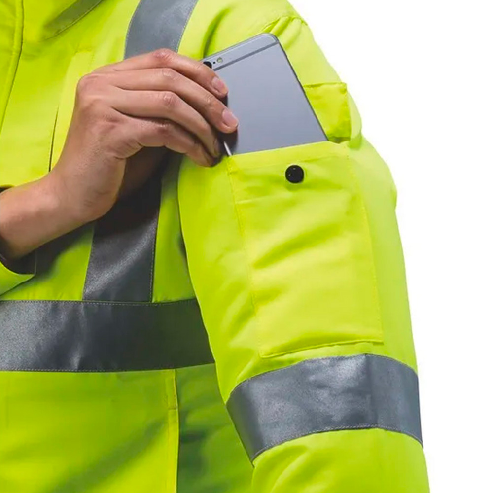 Bolsillo de pecho cuenta con un agujero que permite guardar y cargar dispositivos móviles mientras usa la chamarra (con cable de carga USB opcional).