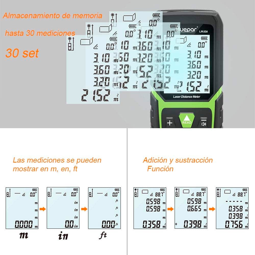 ALTA PRECISIÓN Y UNIDAD DE INTERRUPTOR: La medición de distancia Huepar cuenta con medición de largo alcance con una precisión extrema y puede medir distancias de hasta 165 pies dentro de 1/16-pulgada. La herramienta puede medir desde puntos de referencia delanteros / medios / traseros, lo que facilita la medición en diferentes escenarios. Todas las mediciones se muestran en tiempo real y se pueden cambiar entre M / In / Ft libremente.