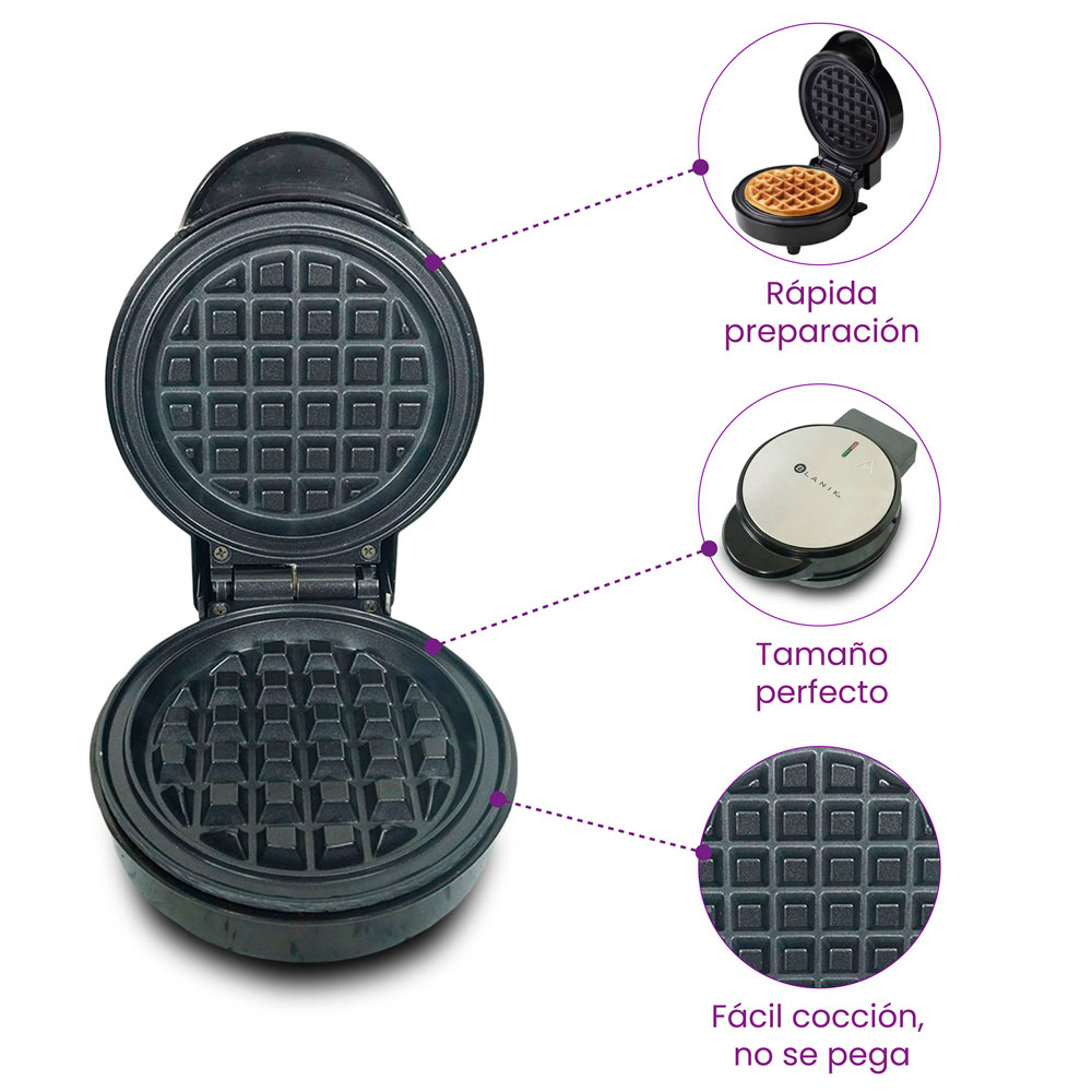 Crea una exquisita especie de galleta gruesa de tipo oblea, con masa crujiente y esponjosa, parecida a un barquillo, que se cocina entre dos planchas calientes. El waffle tiene apariencia de rejilla, resultado de los moldes de nuestra mini waffle que, gracias a su recubrimiento de cerámica, no necesita utilizar aceite, así como también es resistente y fácil de limpiar.