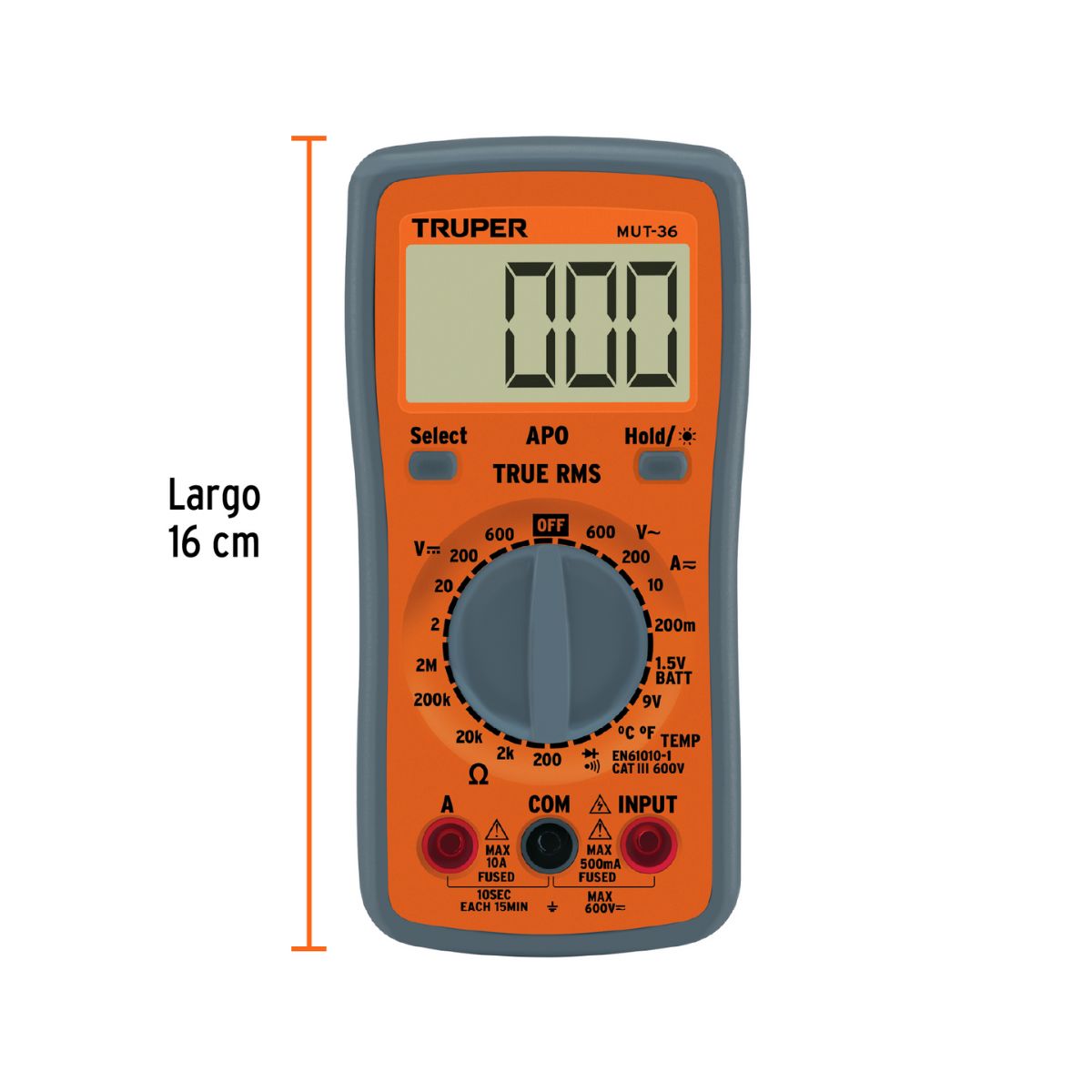 Ideal para mediciones de tensión, corriente, resistencia y temperatura, también cuenta con funciones útiles como prueba de diodo, continuidad audible, retención de datos (HOLD), apagado automático (APO) y true RMS para mayor exactitud.