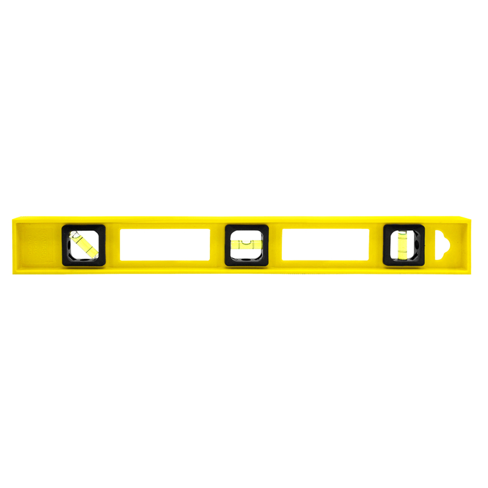 Nivel de resina(plastico) 18″ ABS amarillo con cuerpo extra resistente, burbujas de acrílico de 3/8″ de diámetro para mejor resistencia a impactos y diseño de fácil lectura con su burbuja central para mayor versatilidad