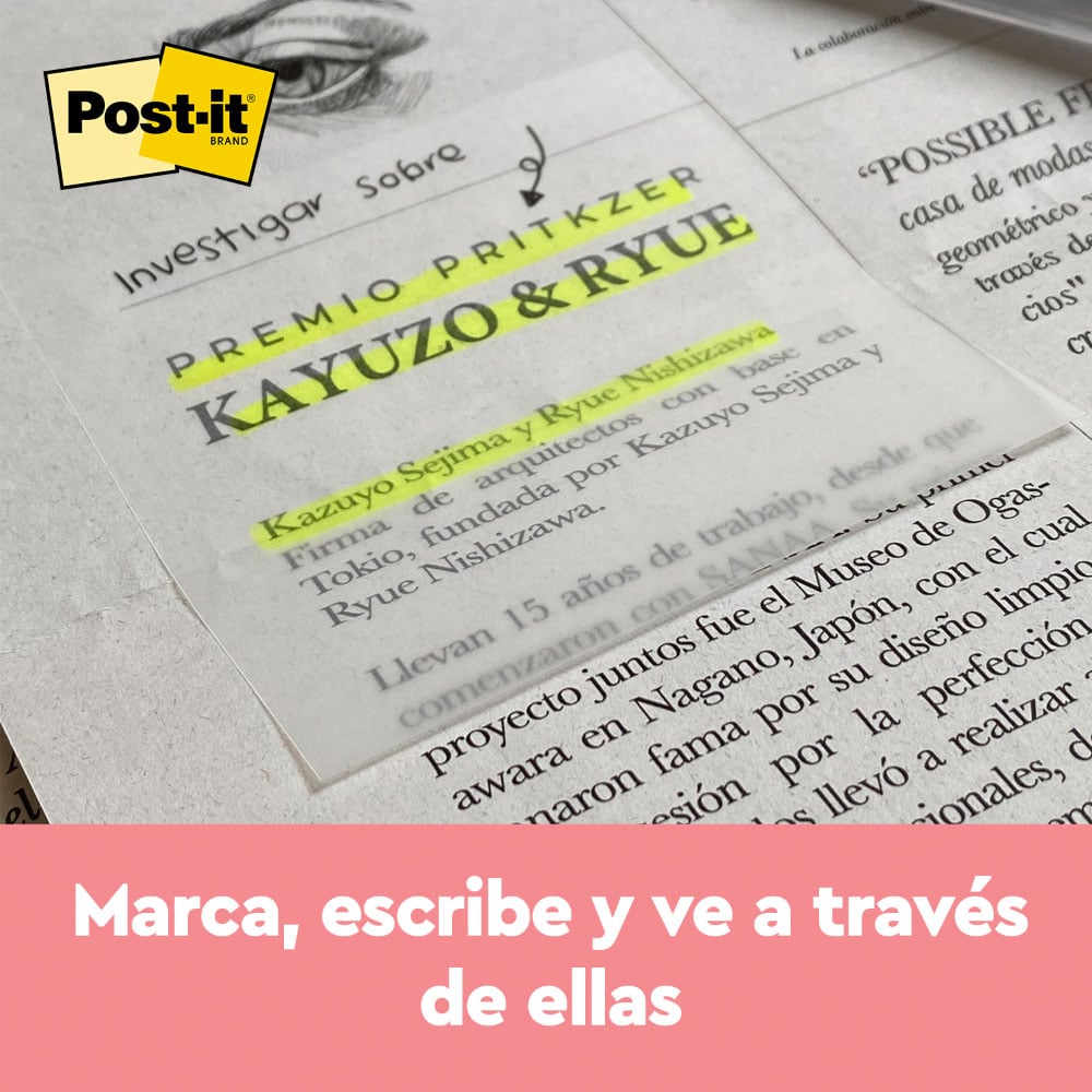 Las Notas Transparentes Post-it® son notas transparentes para su uso en libros,manualidades u otros proyectos en los que es necesario hacer anotaciones en elementos y ver por debajo fácilmente.