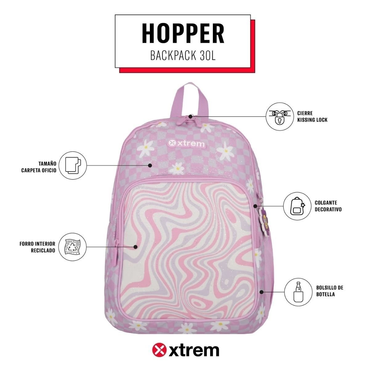 El pack escolar Xtrem Pink Flower ofrece organización, protección y un diseño floral ideal para el colegio. Incluye la mochila Hopper de 30L con espacio para carpetas oficio, bolsillo lateral para botella y cierre Kissing Lock para mayor seguridad. Se complementa con la cartuchera rígida Tucson de dos compartimentos, diseñada para proteger los útiles dentro de la mochila. Ambos productos están fabricados con materiales resistentes y forro interior reciclado, brindando durabilidad y practicidad para el uso diario.