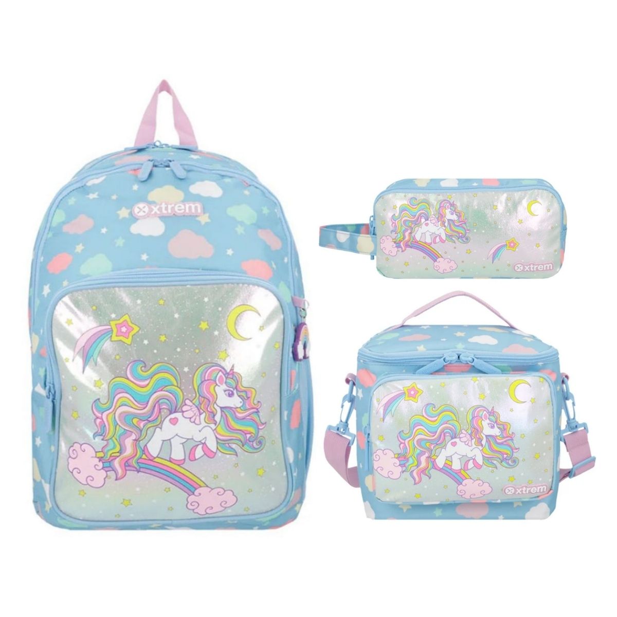 Pack Mochila + Lonchera + Cartuchera Xtrem Multicolour Unicorn Escolar Infantil