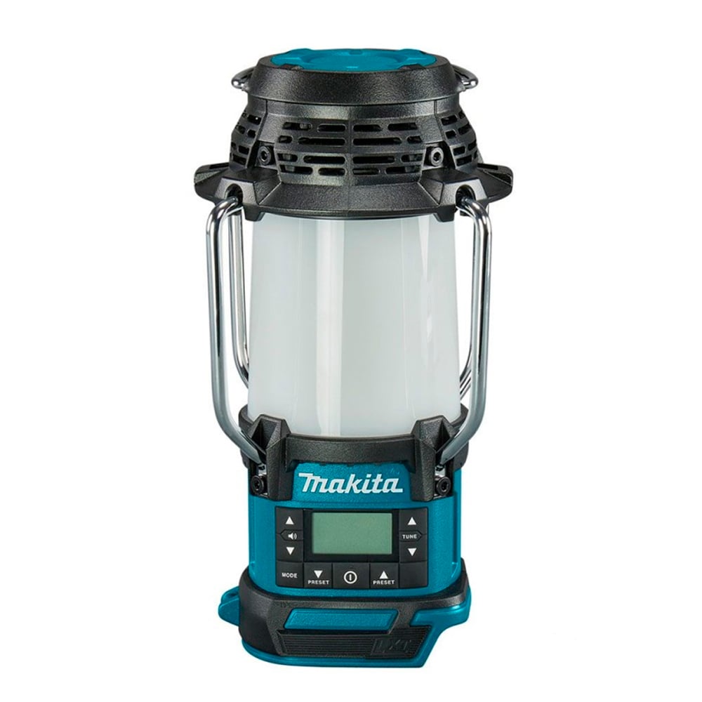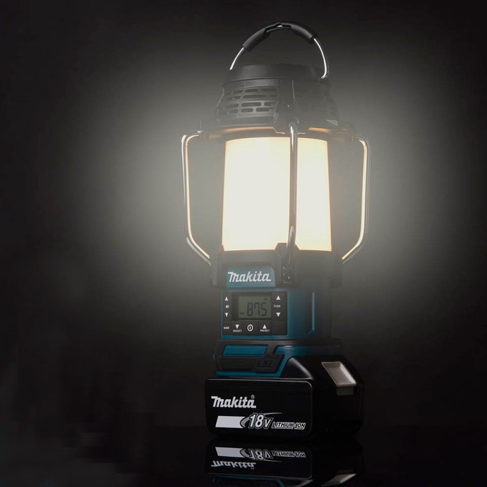 Radio inalámbrica Makita con linterna integrada, diseñada para brindar iluminación y entretenimiento en obras, talleres y trabajos en exteriores. Compatible con baterías Makita LXT de 14.4 V y 18 V, ofrece practicidad y movilidad sin cables.