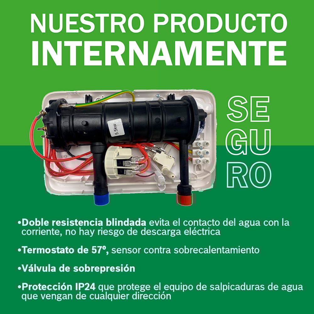 - Contamos con 4 sistemas de seguridad: Doble resistencia blindada, termostato de 57º, válvula de sobrepresión y protección IP24 que protege el equipo de salpicaduras de agua que vengan de cualquier dirección