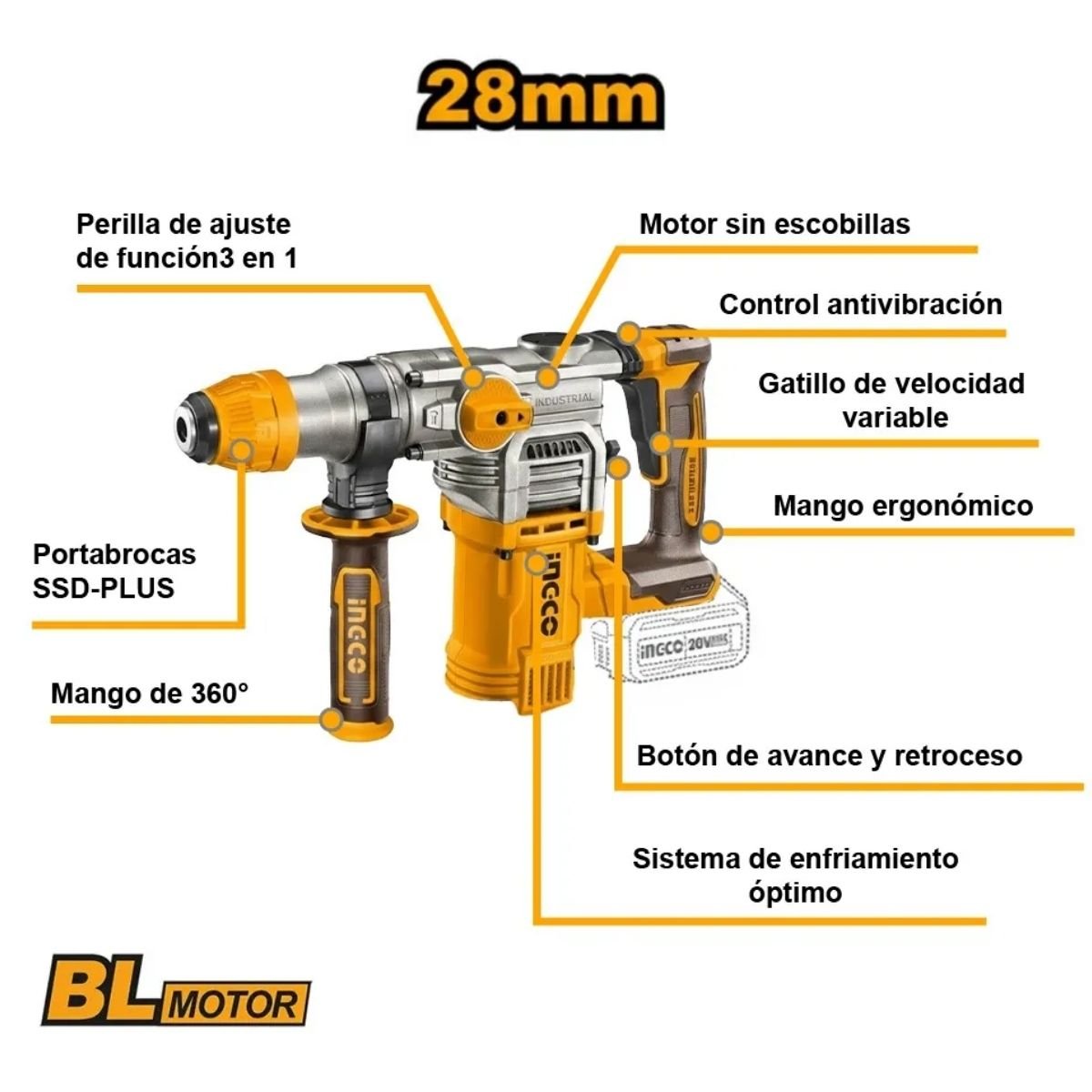 Rotomartillo SDS Plus 4.5J 20V + 2 Baterías 5Ah – INGCO CRHLI202885