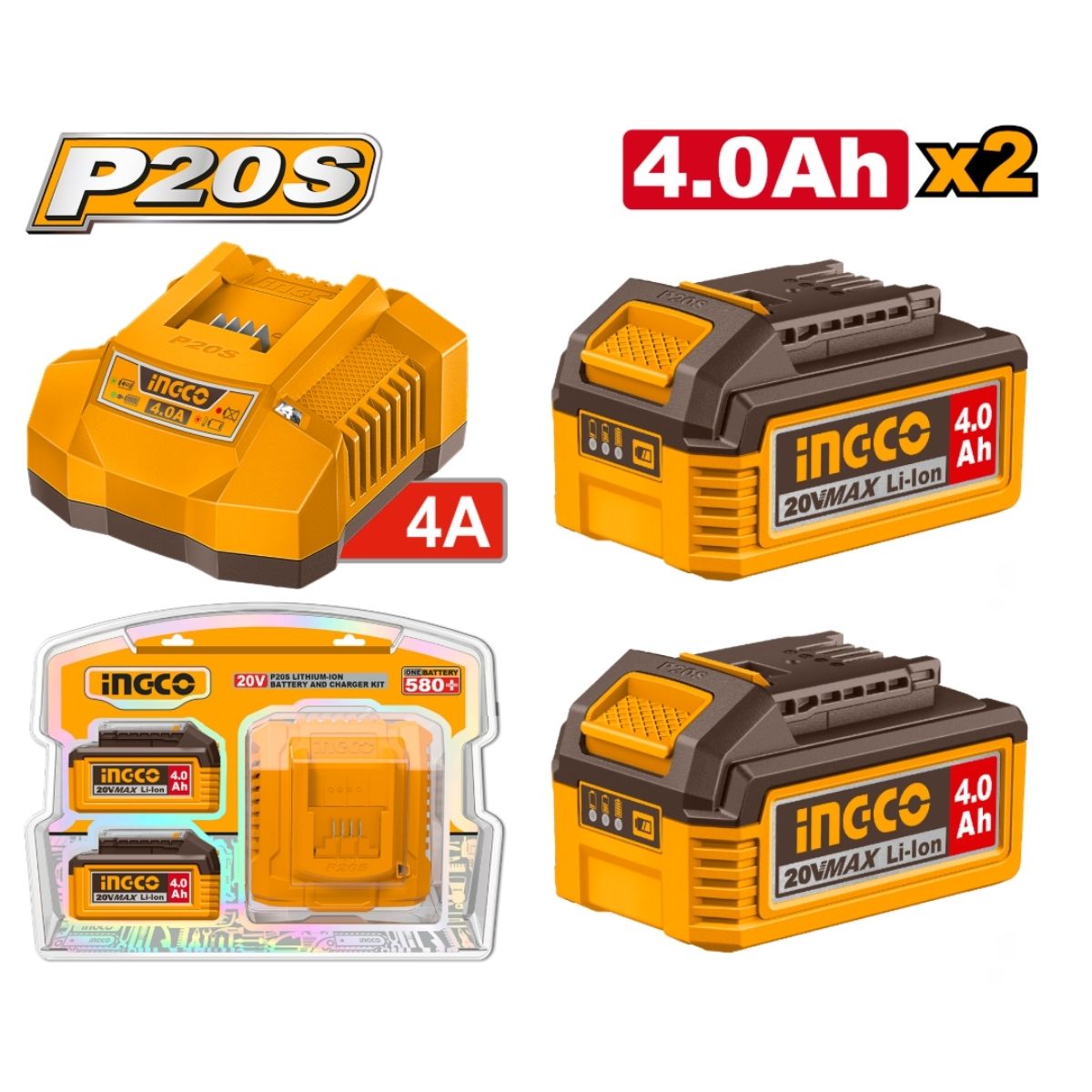 Set 2 Baterías 20V 4.0Ah + Cargador INGCO FBCPK2013